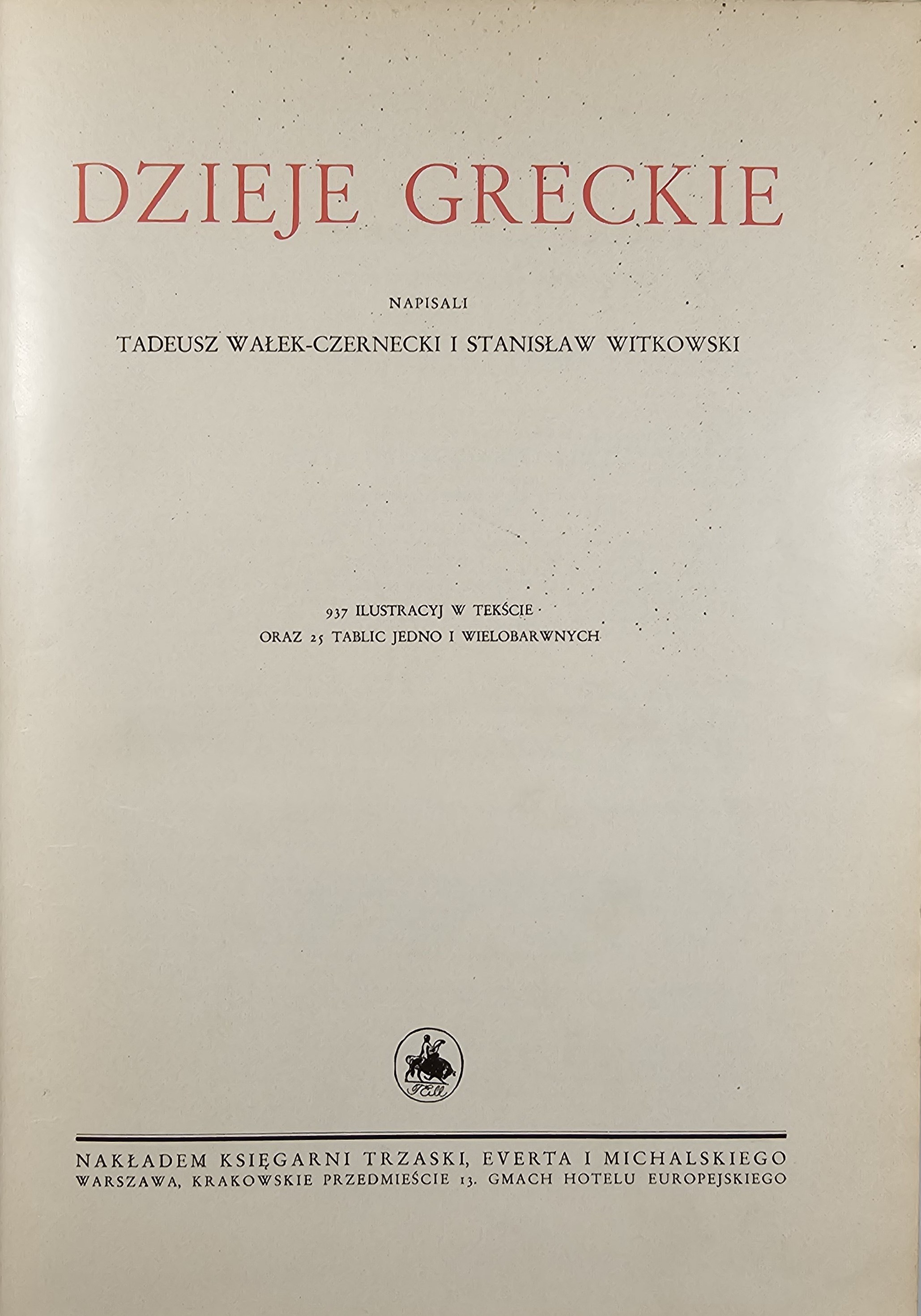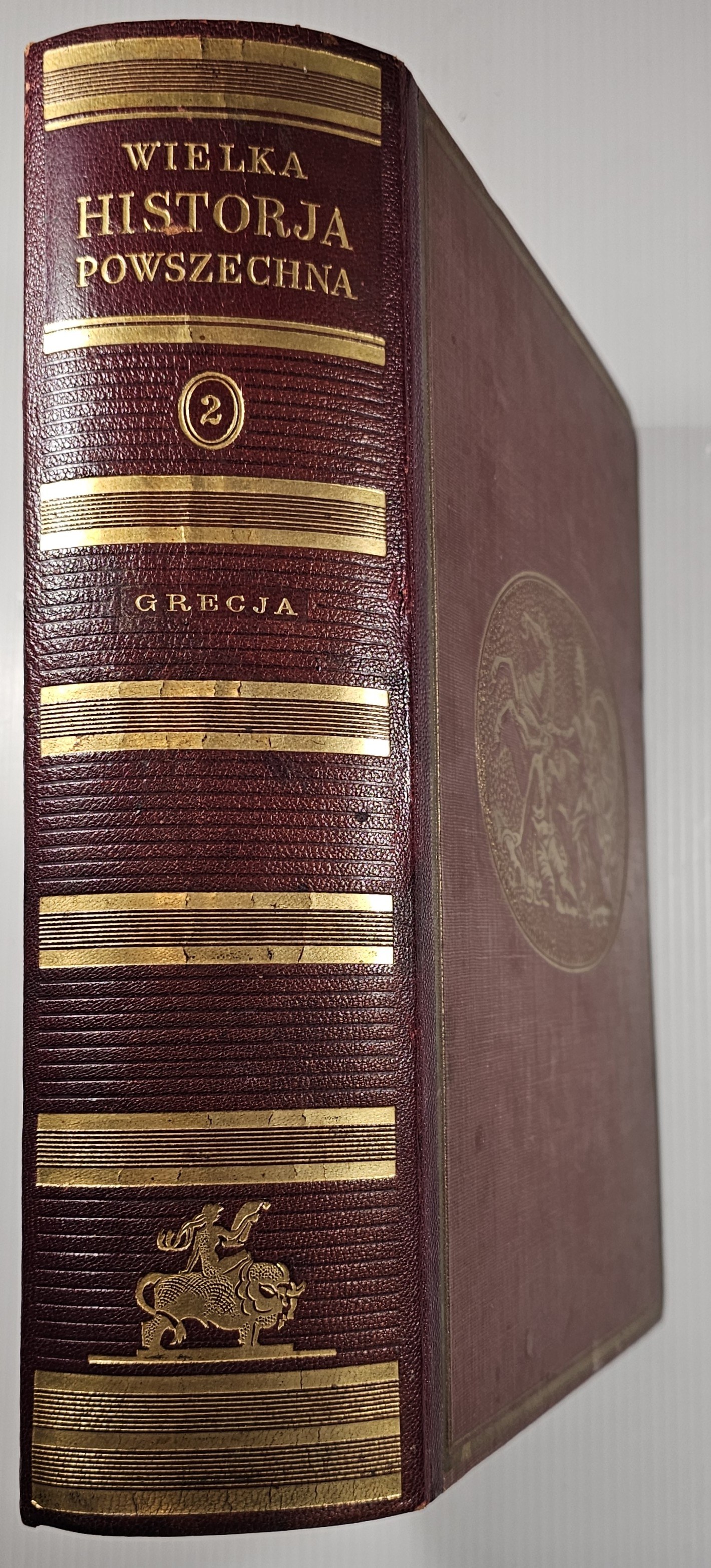 płótno bordowe, złocone zdobienie i napisy: tytuł na grzbiecie: Wielka Historja Powszechna. 2. Grecja.