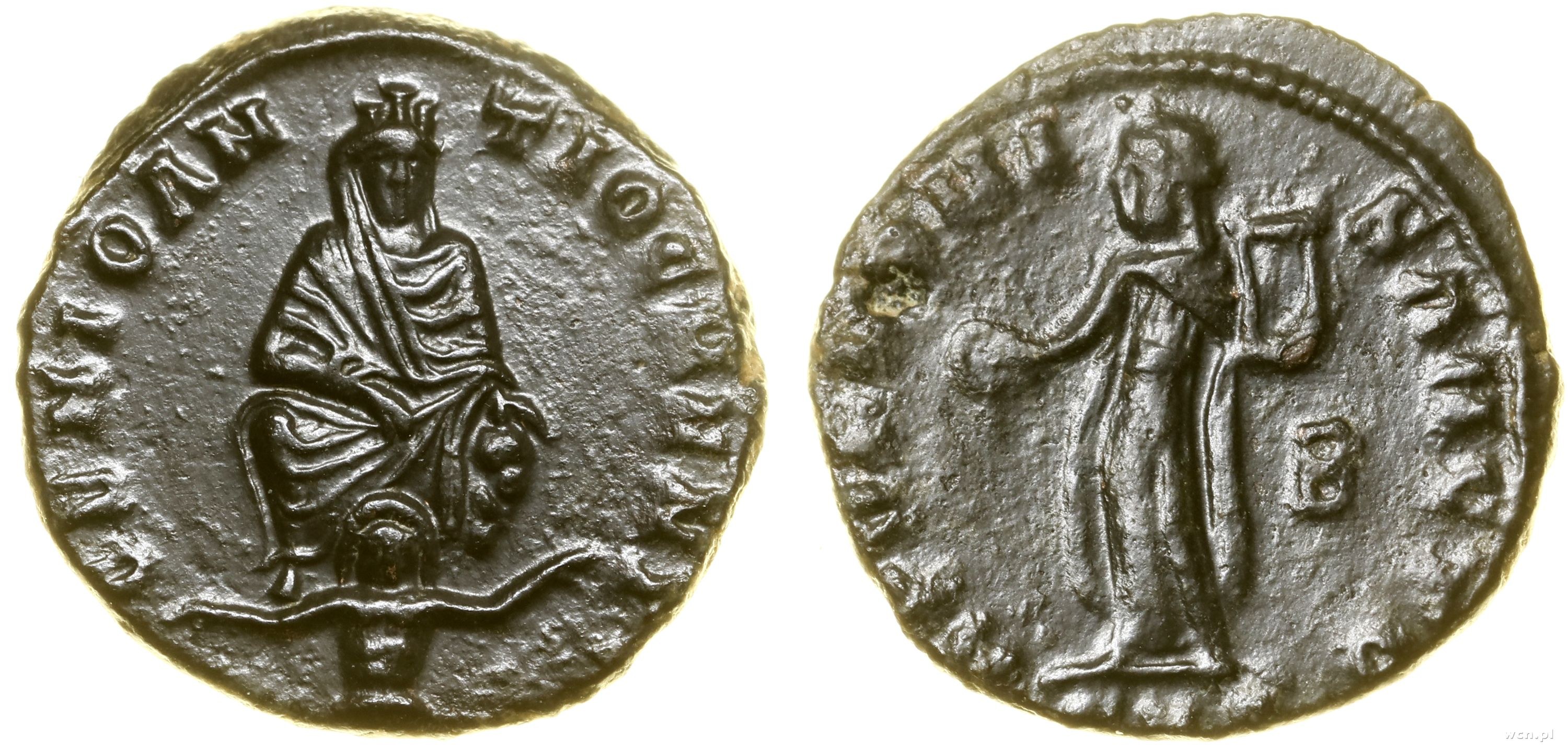 Aw: Tyche siedząca na tronie, na wprost, poniżej Orontes, GENIO ANTIOCHENI, Rw: Apollo stojący w lewo, trzymający paterę, APOLLONI SANCTO, z prawej B, w odcinku SMB(?)