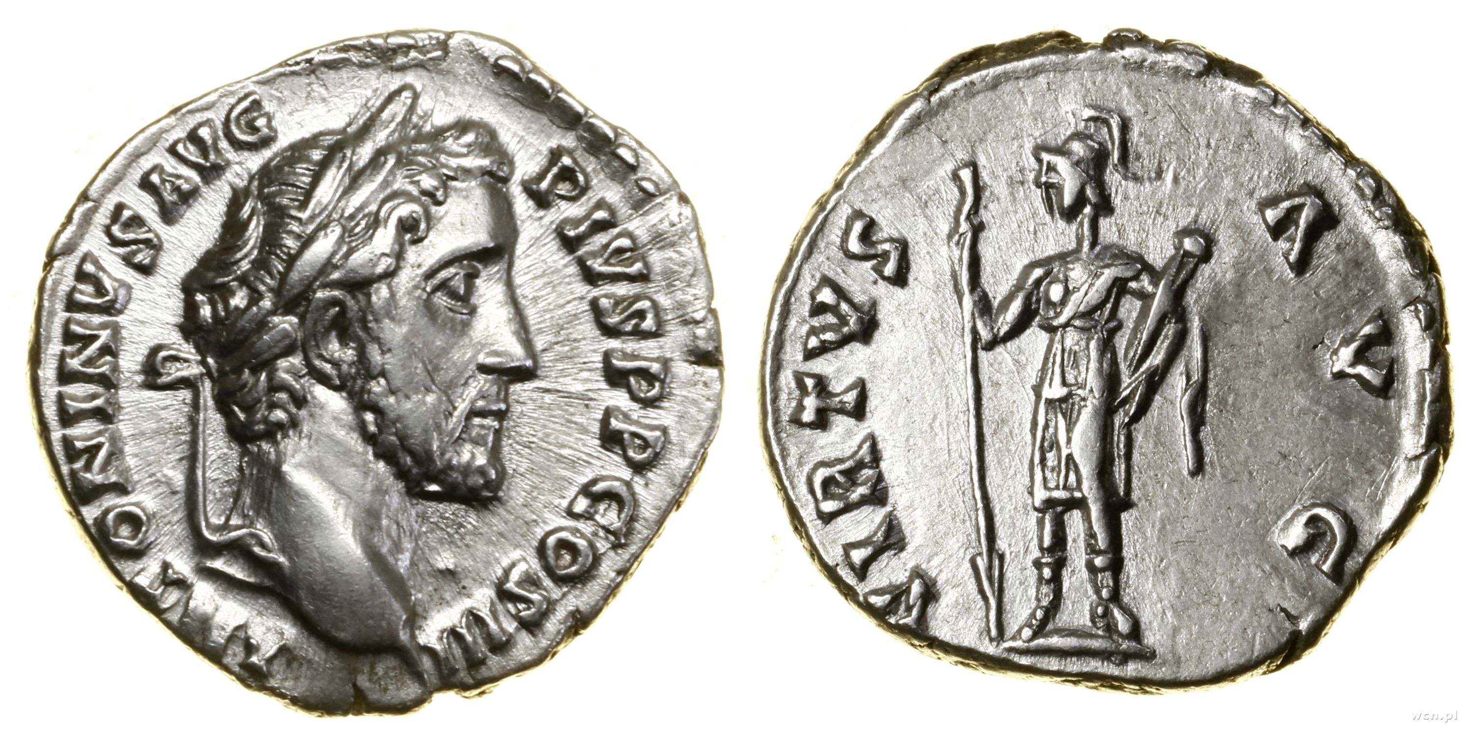 Aw: Głowa cesarza w wieńcu laurowym w prawo, ANTONINVS AVG PIVS PP TR P COS III, Rw: Virtus stojący lekko w lewo, z włócznią i parazonium, VIRTVS AVG