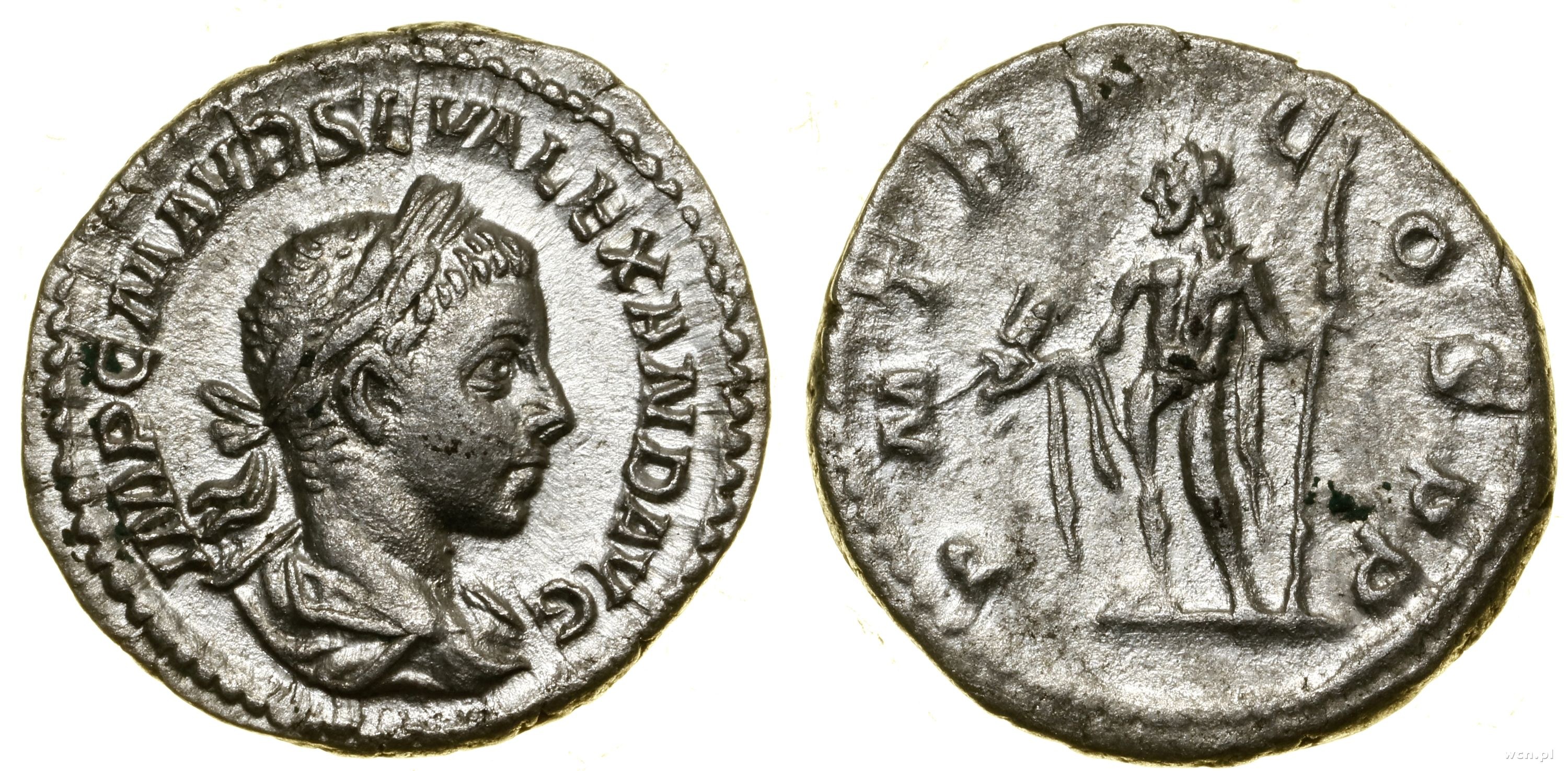 Aw: Popiersie władcy w prawo, IMP C M AVR SEV ALEXAND AVG, Rw: Jowisz w lewo, w prawej ręce trzyma wiązkę piorunów, w lewej włócznię, P M TR P COS P P