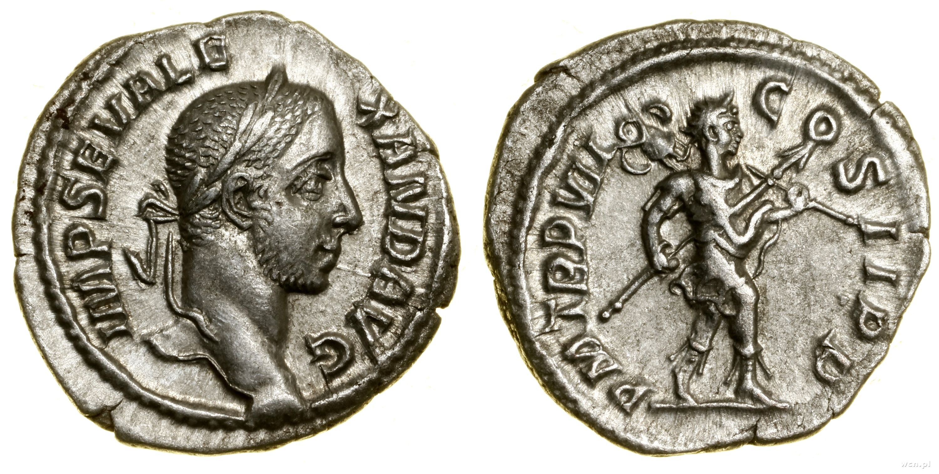 Aw: Popiersie cesarza w wieńcu laurowym, IMP SEV ALEXAND AVG, Rw: Kroczący Romulus, niesie włócznię i trofeum, P M TR P VII COS II P P