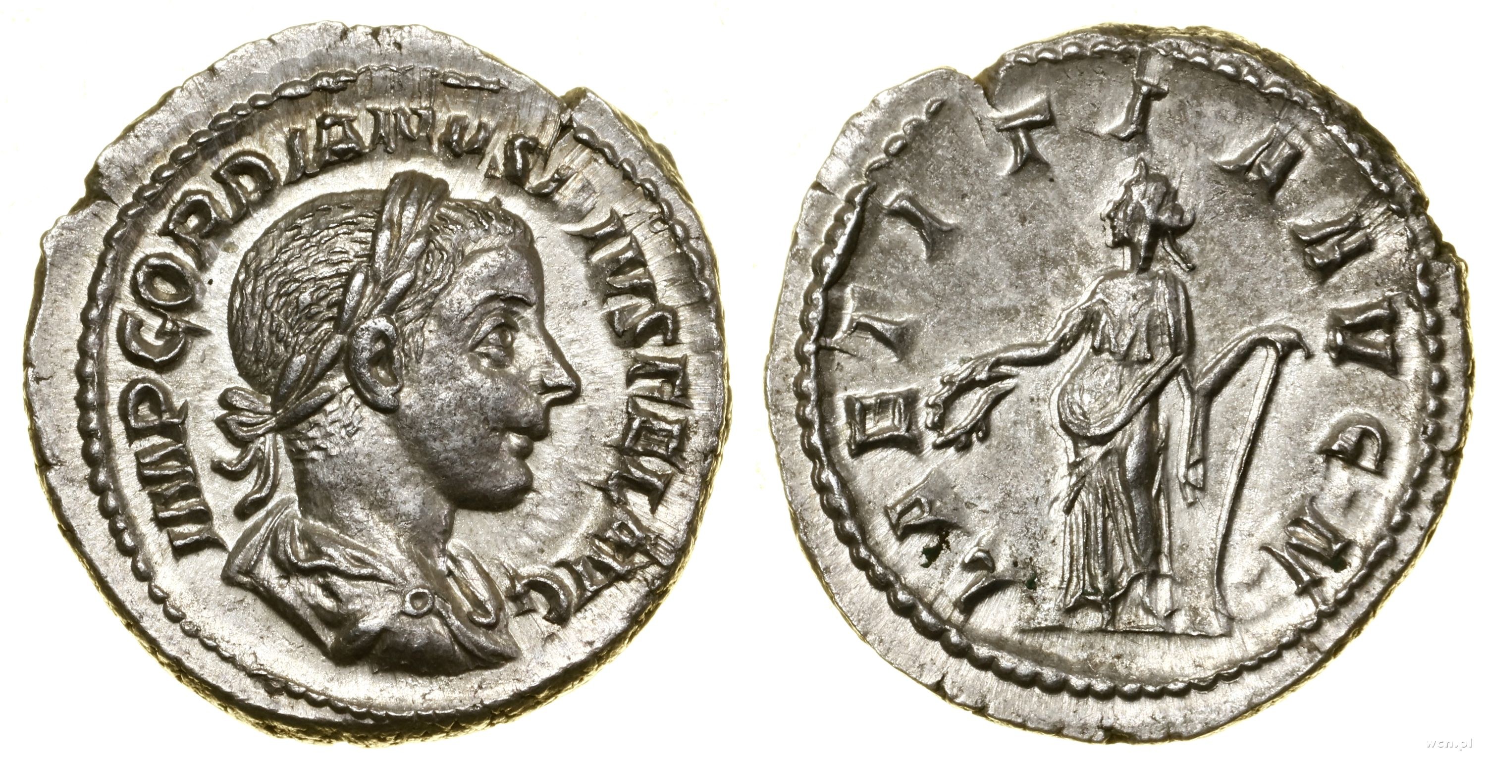 Aw: Popiersie cesarza w wieńcu laurowym w prawo, IMP GORDIANVS PIVS FEL AVG, Rw: Laetitia stojąca w lewo, trzymająca wieniec i kotwicę, LAETITIA AVG N