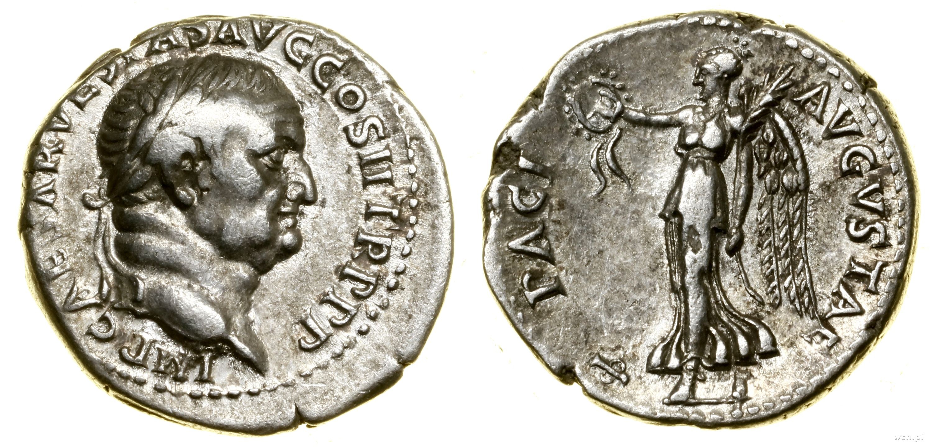 Aw: Popiersie cesarza w prawo i napis IMP CAESAR VESPAS AVG COS II TR P P P, Rw: Stojąca w lewo Wiktoria, trzymająca wieniec i gałązkę palmową, poniżej Ф, wokoło napis PACI AVGVSTAE