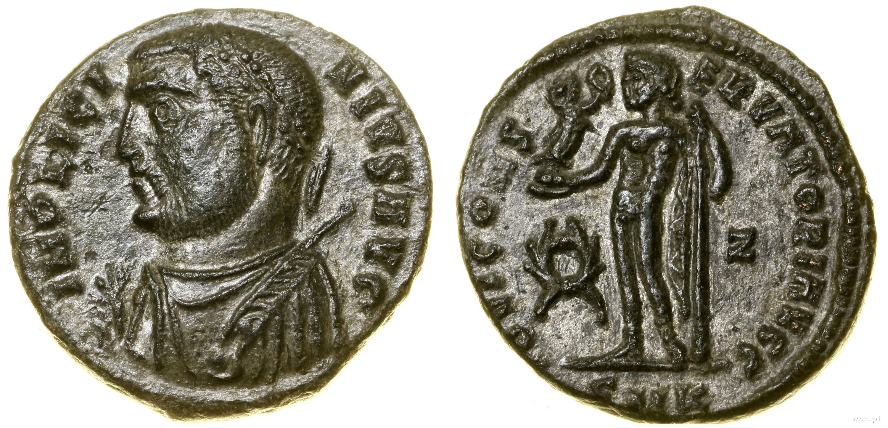 Aw: Popiersie cesarza w lewo, IMP LICINIVS AVG; Rw: Jowisz stojący w lewo, trzymający Wiktorię na globie oraz berło, IOVI CONSERVATORI AVGG, w polu wieniec i Z, w odcinku SMK