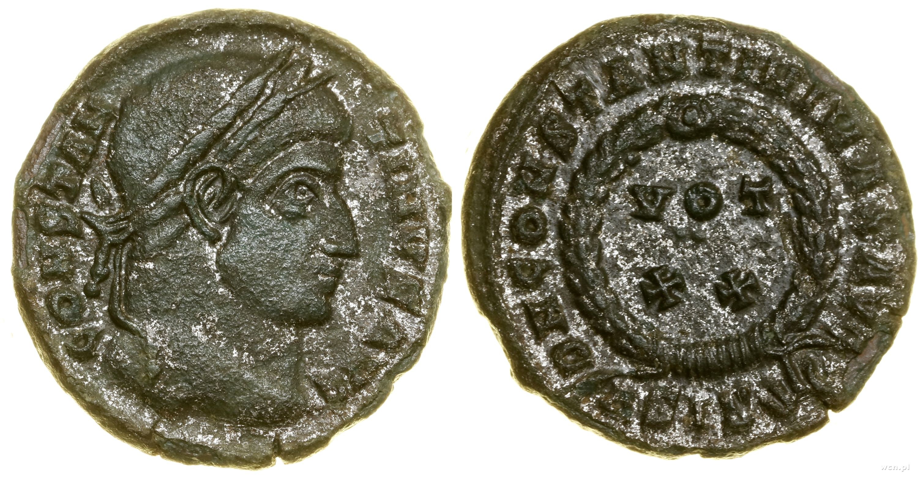 Aw: Głowa cesarza w wieńcu w prawo, CONSTANTINVS AVG; Rw:W wieńcu laurowym VOT XX, w otoku D N CONSTANTINI MAX AVG, u dołu ASIS (promienisty łuk)