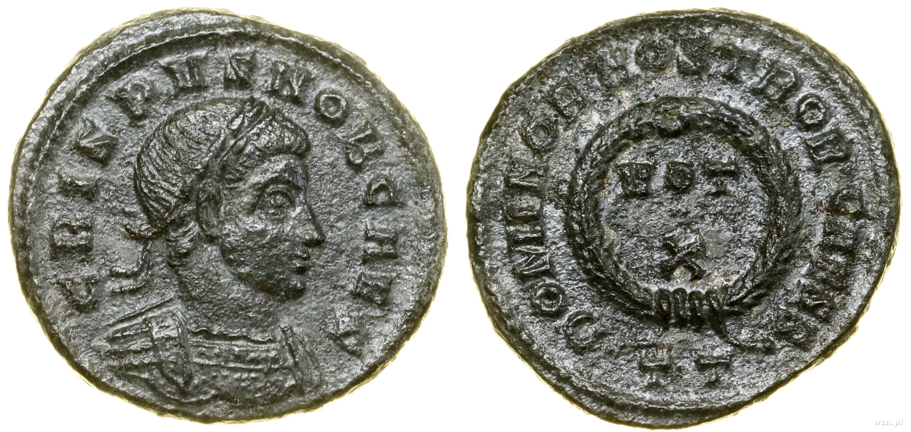 Aw: Popiersie cesarza w prawo, CRISPVS NOB CAES, Rw: W wieńcu VOT / X, DOMINOR NOSTROR CAESS, w odcinku TT