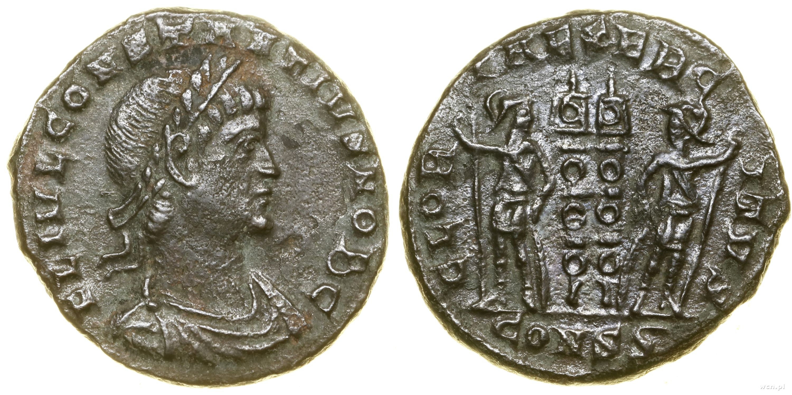 Aw: Popiersie władcy w prawo, FL IVL CONSTANTIVS NOB C, Rw: Dwaj żołnierze stojący naprzeciw siebie, trzymający włócznie i tarcze, między nimi dwa sztandary legionowe, GLORIA EXERCITVS, w odcinku CONSS