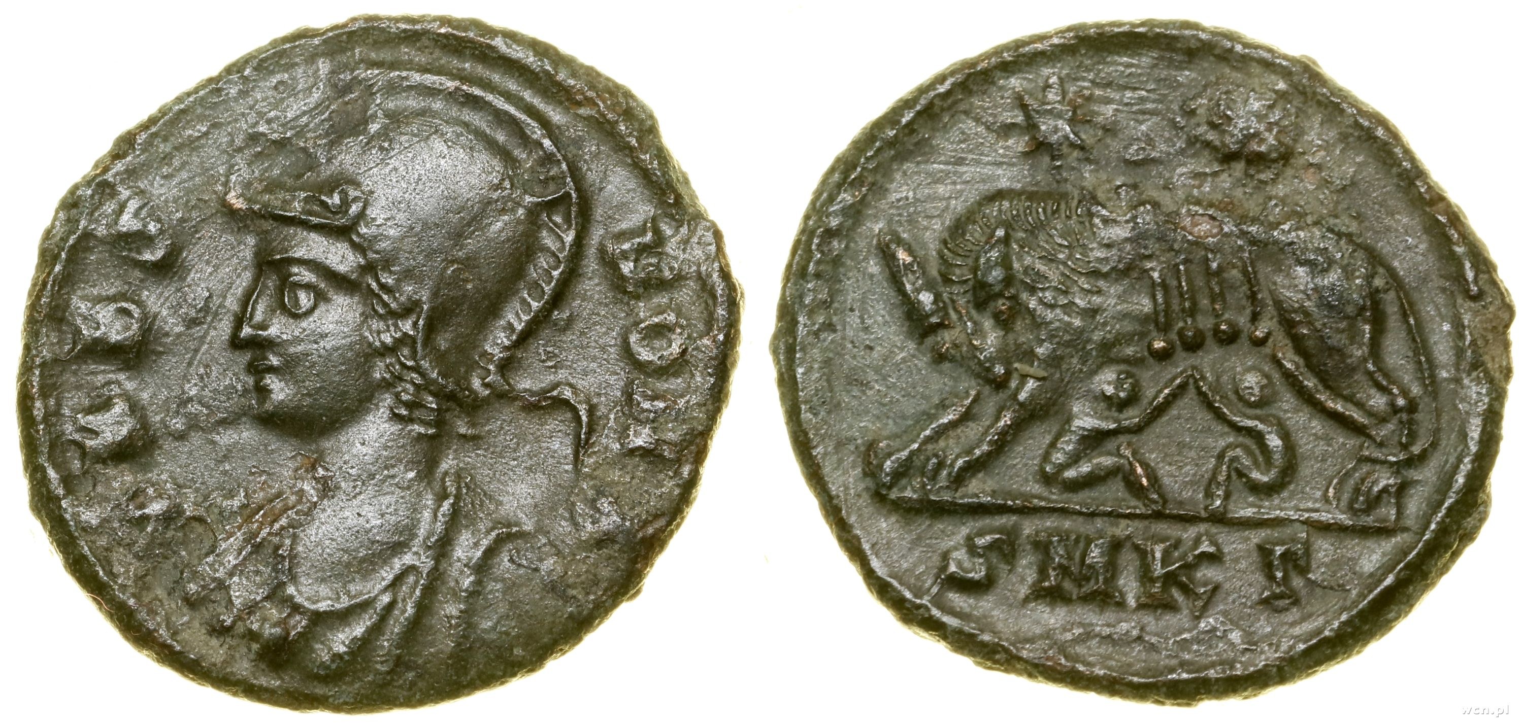 Aw: Popiersie Romy w lewo, VRBS ROMA, Rw: Wilczyca karmiąca ludzkie bliźnięta, u góry dwie gwiazdy, w odcinku SMKΓ