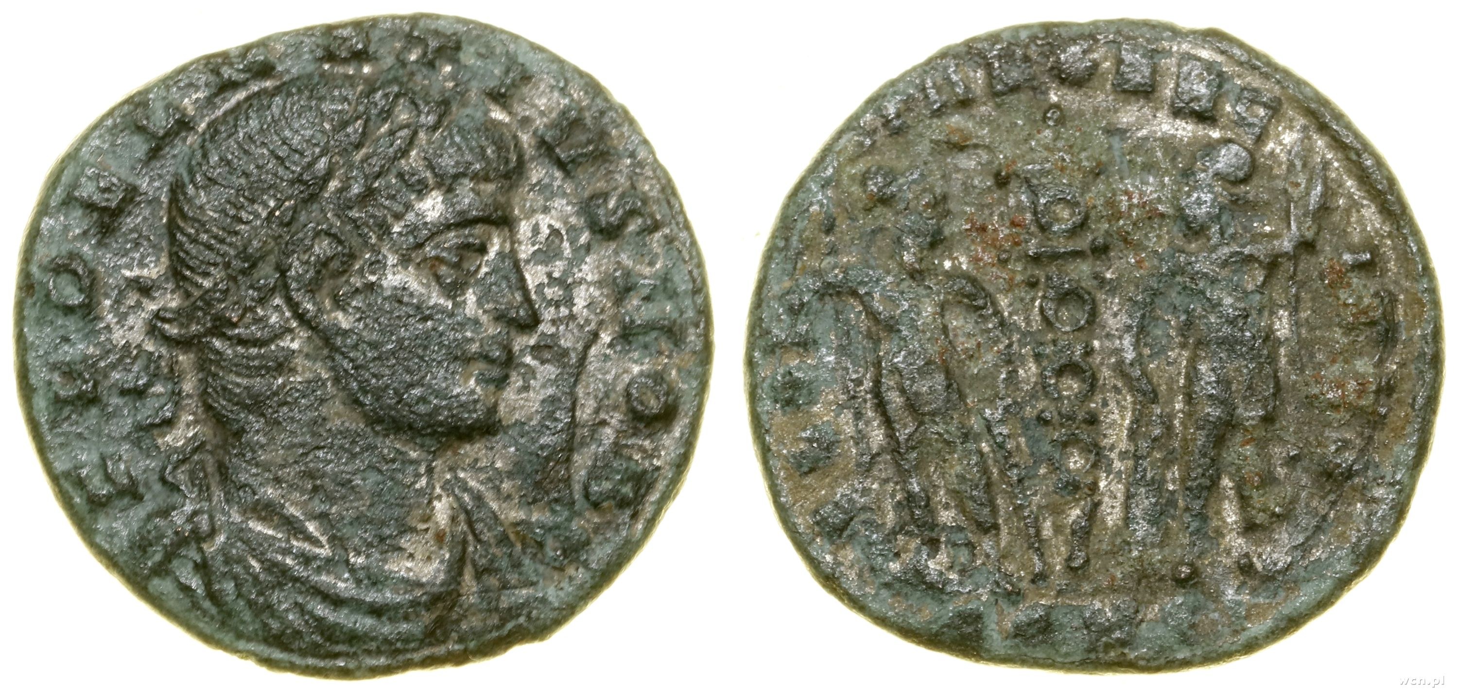 Aw: Popiersie w prawo, FL DELMATIVS NOB C; Rw: Dwaj żołnierze z włóczniami, między nimi sztandar legionowy, GLORIA EXERCITVS, w odcinku niewidoczne oznaczenie mennicy