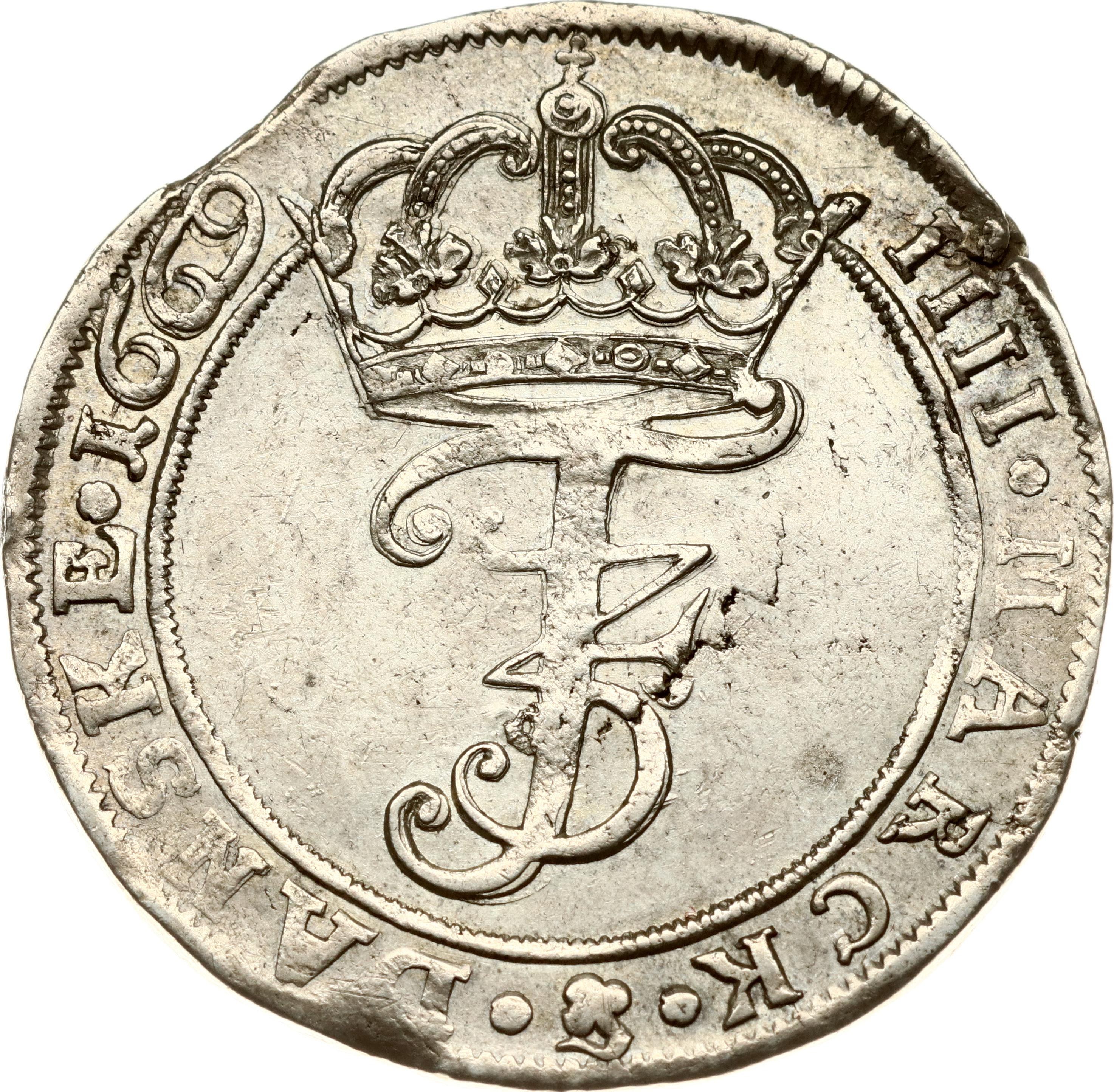 Denmark. Frederick III (1648-1670). 4 Mark 1669. Silver 19.02 g. KM 276, Dav 3582. Surface damage.
