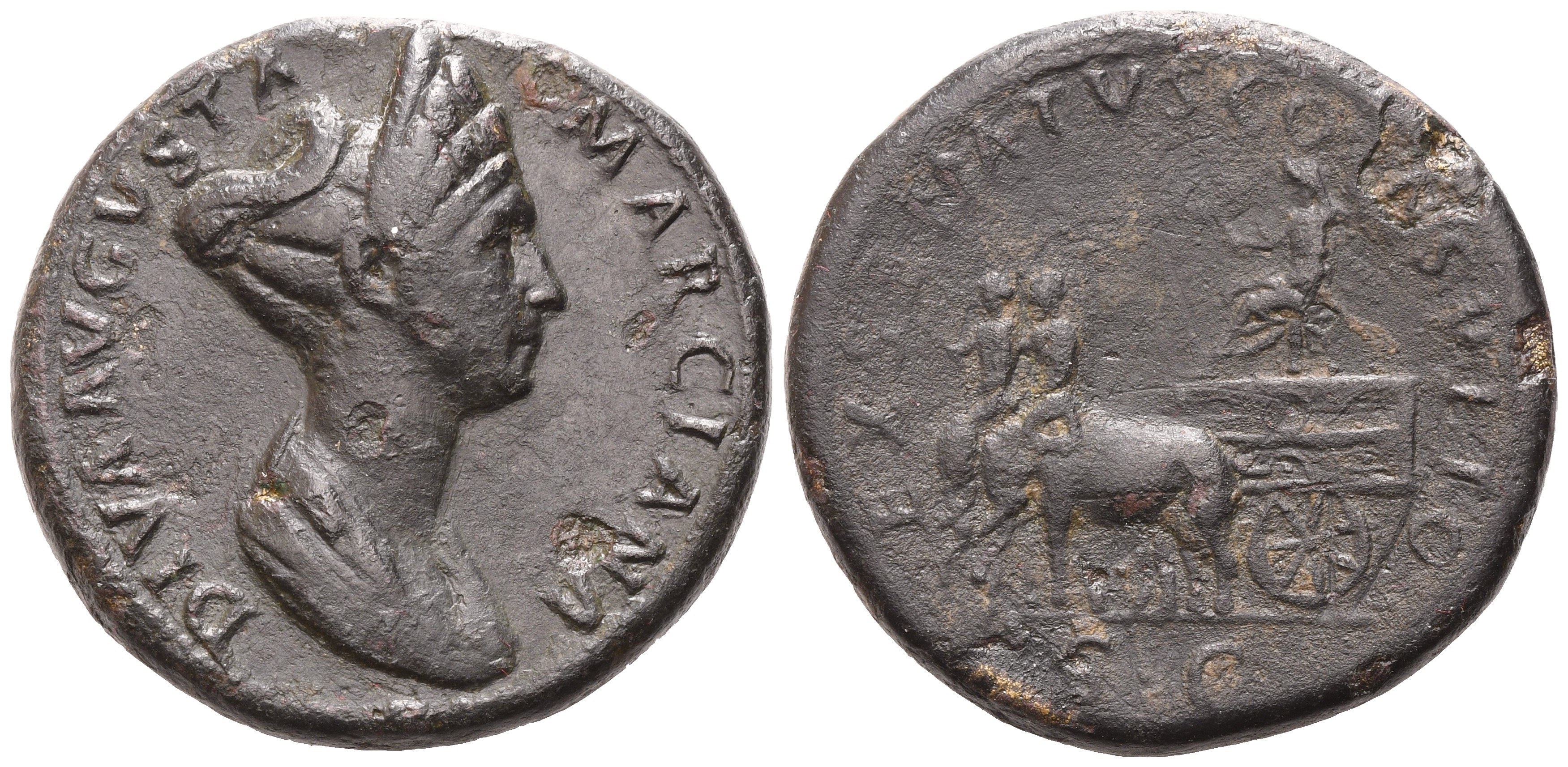 Diva Marciana, Sestertius struck under Trajan, Rome, c. AD 112-117; Æ (g 27,15; mm 33); DIVA AVGVSTA - MARCIANA, draped bust r., hair elaborately dressed over brow, above which is a stephane, braided and bound up at the back, Rv. EX SENATVS CONSVLTO, Diva Marciana, holding patera and sceptre, seated l. on cart drawn by two elephants, each with its own mahout; in ex. S C. RIC 750; C 13.Very rare. Dark patina; somewhat smoothed; very fine.