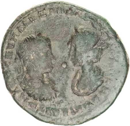 Moesia Inferior-Marcinopolis; AE 26, A: Portréty proti sobě, opis / stoj. Dionýsos drží v levé ruce roh hojnosti, pravou nalévá vín o z kanthara, vpravo písmeno E Pic 953; Varbanov 1623; pod. SGI: 3147