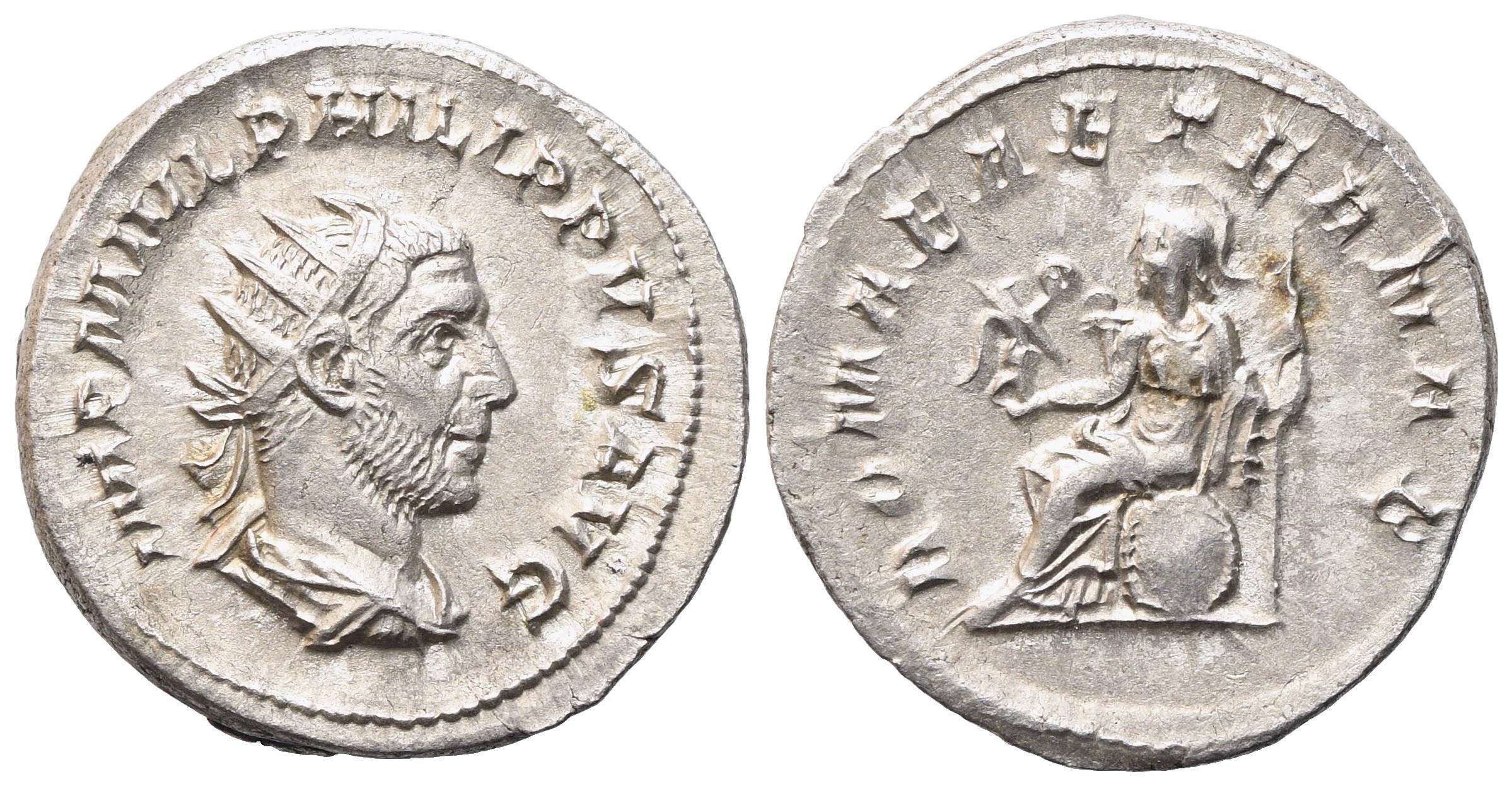 IMP M IVL PHILIPPVS AVG Radiate, draped and cuirassed bust r.; Rv. ROMAE AETERNAE Roma seated l. on throne, holding Victory in her r. hand and spear in her l.; at her side, shield. RIC 44b. Extremely fine.