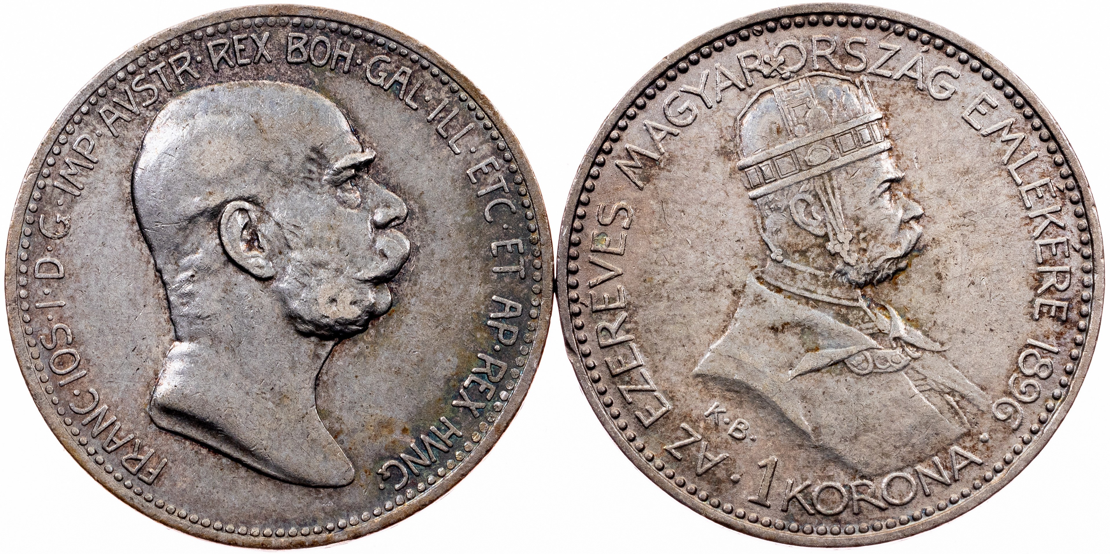 Franz Joseph I, 1 Korona, 1 Krone 1896, 1908, Kremnitz, Vienna, 10,021 g, Silver (835/1000), Lot of 2pcs; VF-EF