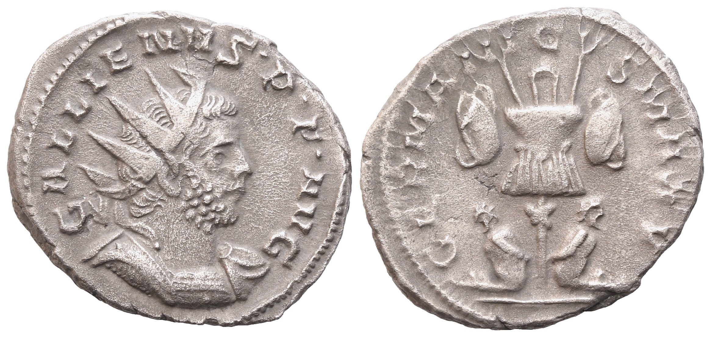 GALLIENVS P F AVG, Radiate and cuirassed bust of Gallienus r.; Rv. GERMANICVS MAX V Trophy flanked by bound and seated captives. RIC 18; Göbl 872l; cf. RSC 308 (bust type). Good very fine.