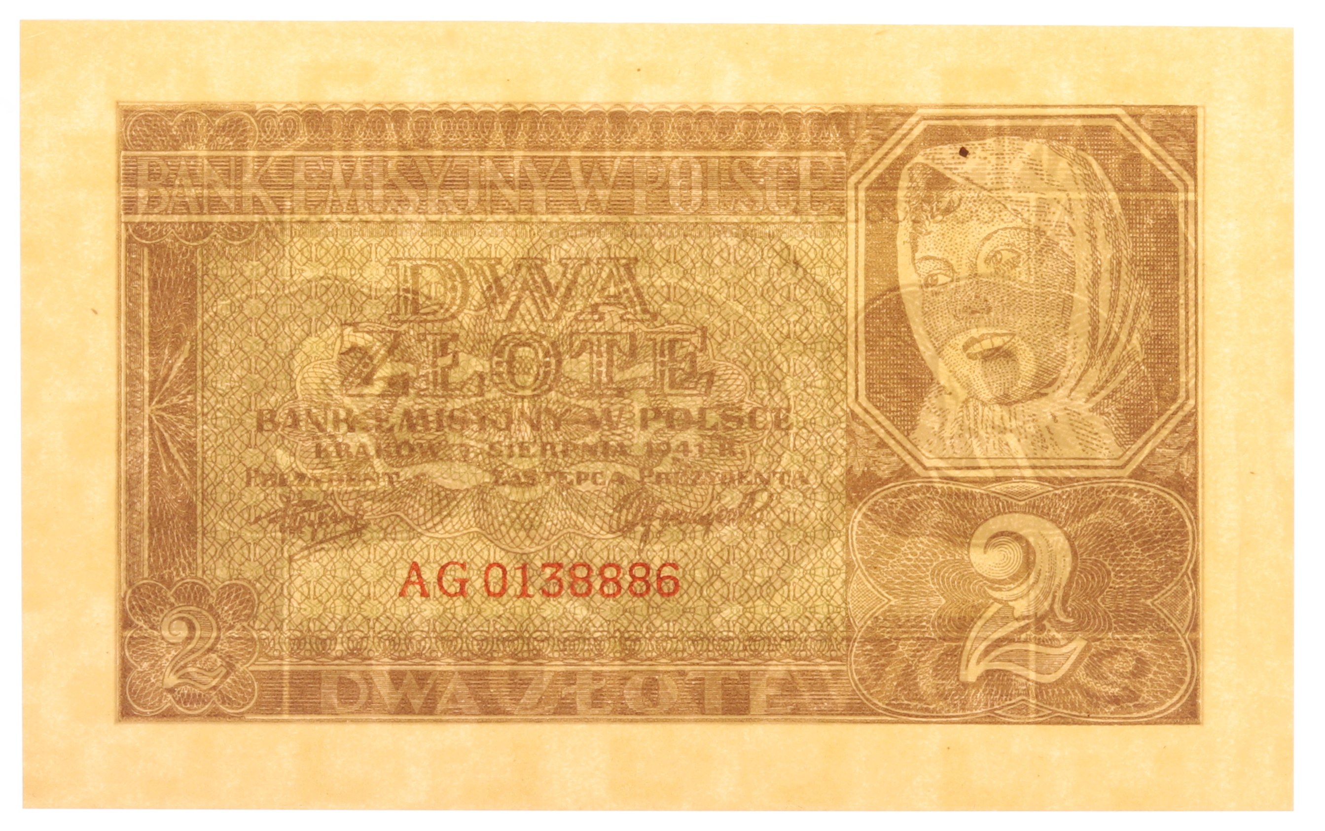 Banknot autorstwa Leonarda Sowińskiego ze znakiem wodnym w postaci wzoru geometrycznego z jasnych i ciemnych prostokątów.