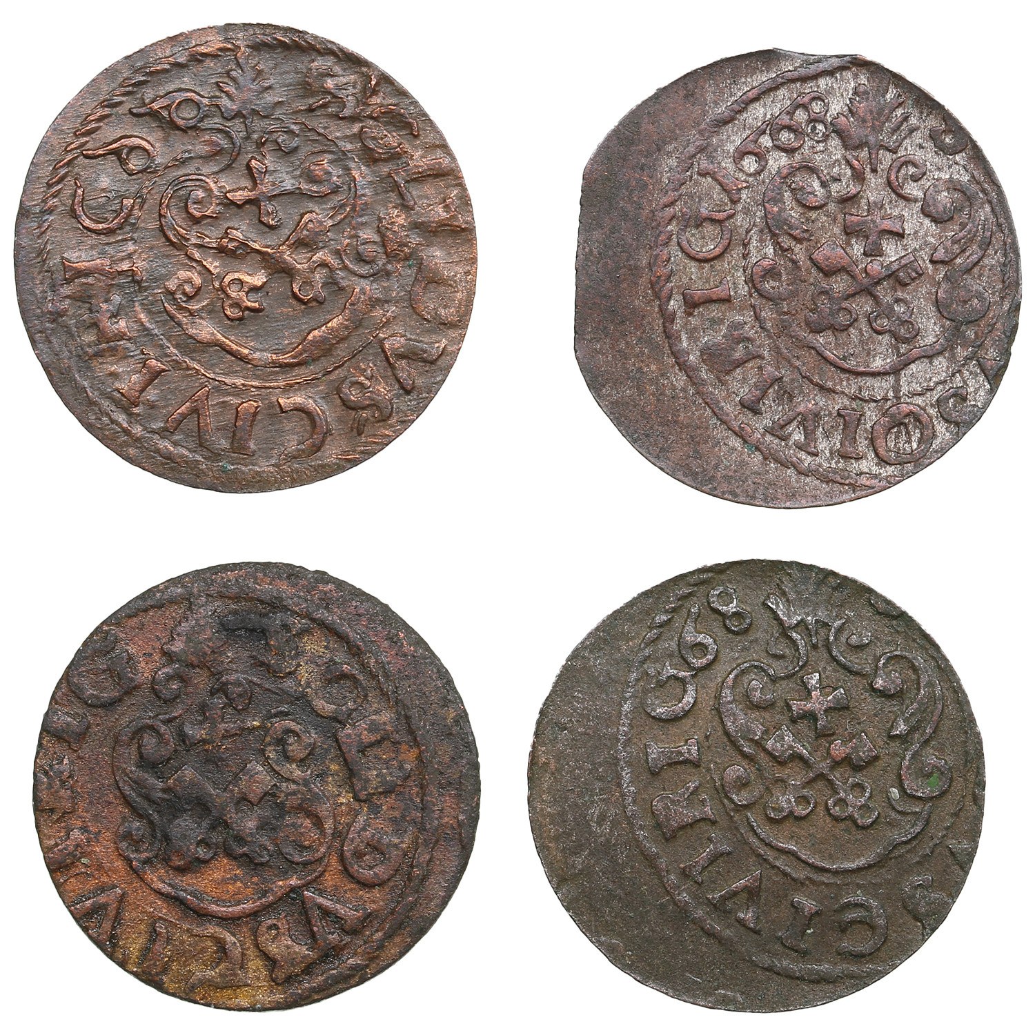 Various conditions. Imitating City of Riga type under Swedish rule. Minted in 1662-1672. ‘Christina’ dated 66 (inverted), 68. Haljak 1605. ‘Karl X Gustav’ dated 1668. Haljak 1609. ‘Karl XI’ ND. Haljak 1614. Issue historically associated with present-day Sweden, Romania and Latvia.