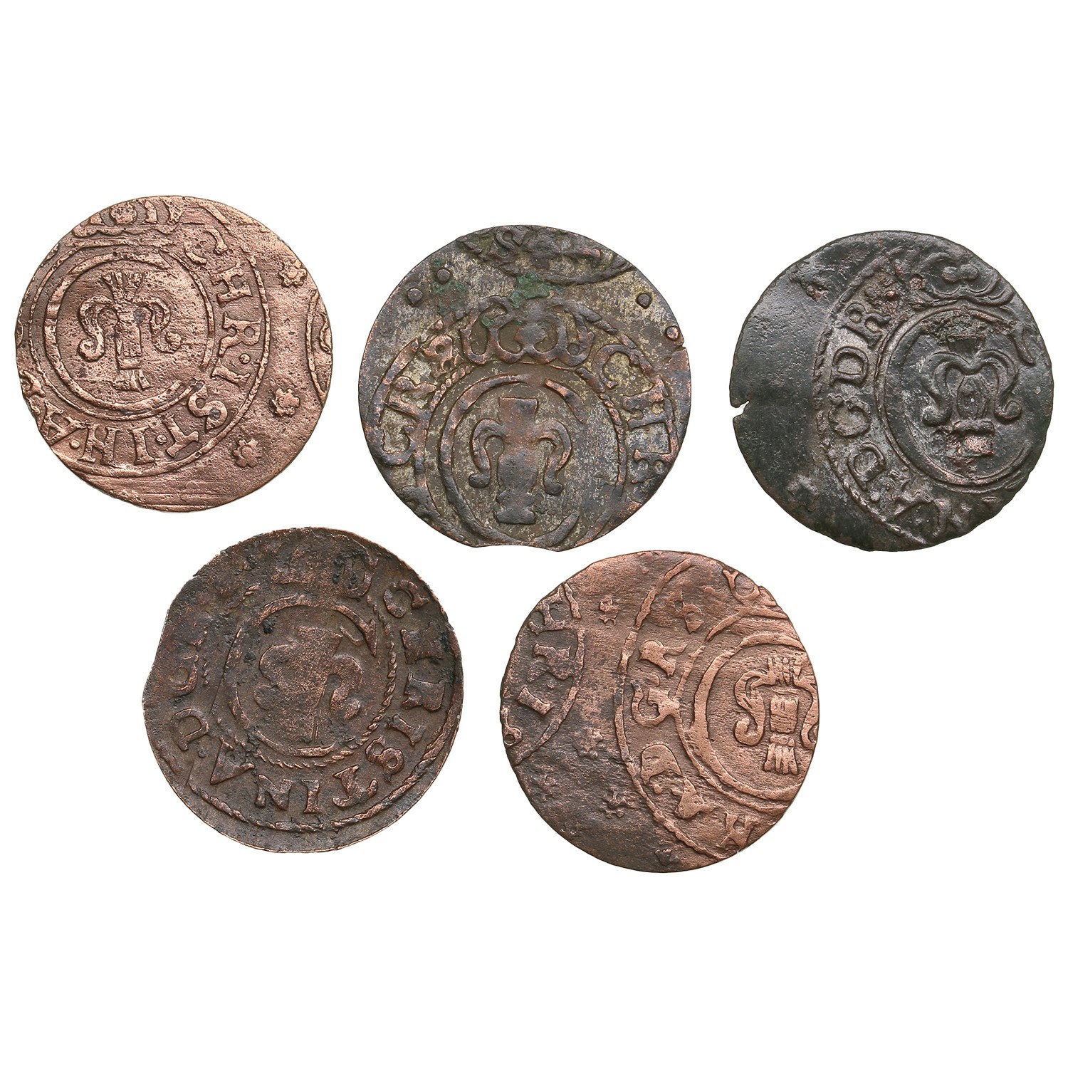 Various conditions. Imitating City of Riga type under Swedish rule. Minted in 1662-1672. ‘Christina’ dated ·9·, 163 (3 inverted), 64, 165, ND. Haljak 1603; 1604; 1606. Issue historically associated with present-day Sweden, Romania and Latvia.