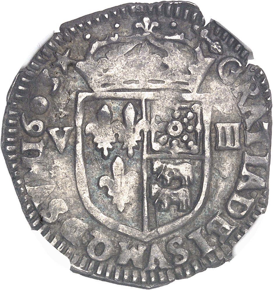 Rv. (différent) GRATIA. DEI. SVM. Q. D. SVM. (date) (différent). Écu couronné, parti de France, mi-coupé de Navarre-Béarn, accosté de V - III.