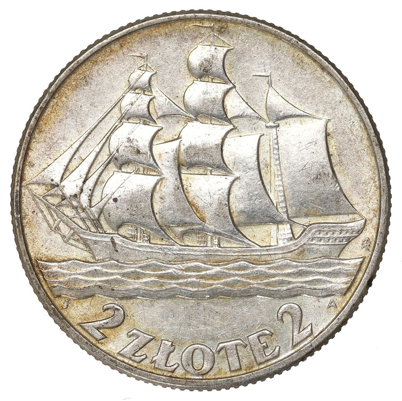 Rewers: widok okrętu na morzu, niżej napis 2 ZŁOTE 2, inicjały projektanta J-A. Nad falami, po prawej herb Kościesza – znak Mennicy Państwowej w Warszawie.