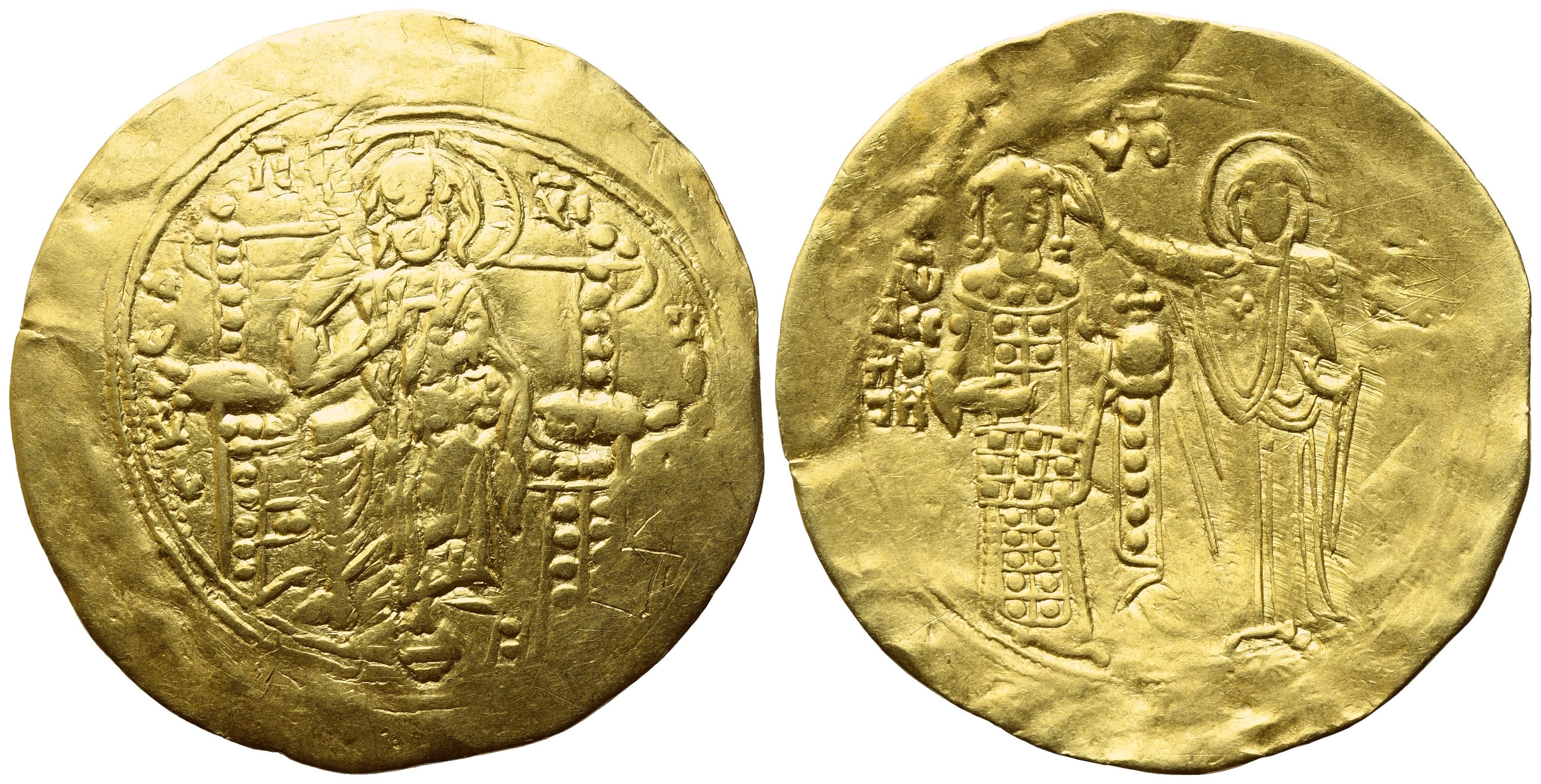 +K-Є RO-HΘЄI, Christ enthroned facing, wearing nimbus cruciger with single pellet in each arm, pallium and colobium, raising right hand in benediction, book of Gospels in left; IC-XC (barred) across fields; Rv./ IW / ΔЄC / ΠO / TH, The Virgin, on right, nimbate, standing facing, wearing pallium and maphorium, left hand raised in benediction, crowning with right hand John II, on left, standing facing, wearing divitision and loros, right hand on chest, holding globus cruciger in left; VΘ (barred) above, MHP (barred, retrograde, and ligate) in right field. DOC 3. SB 1940. Good VF
