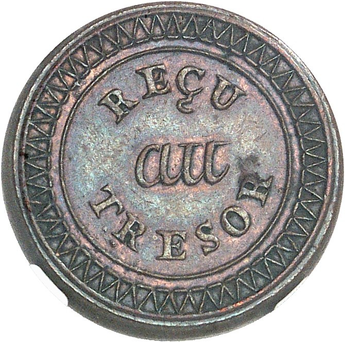 Av. Dans un grènetis hachuré, en trois lignes : REÇU AU TRESOR.