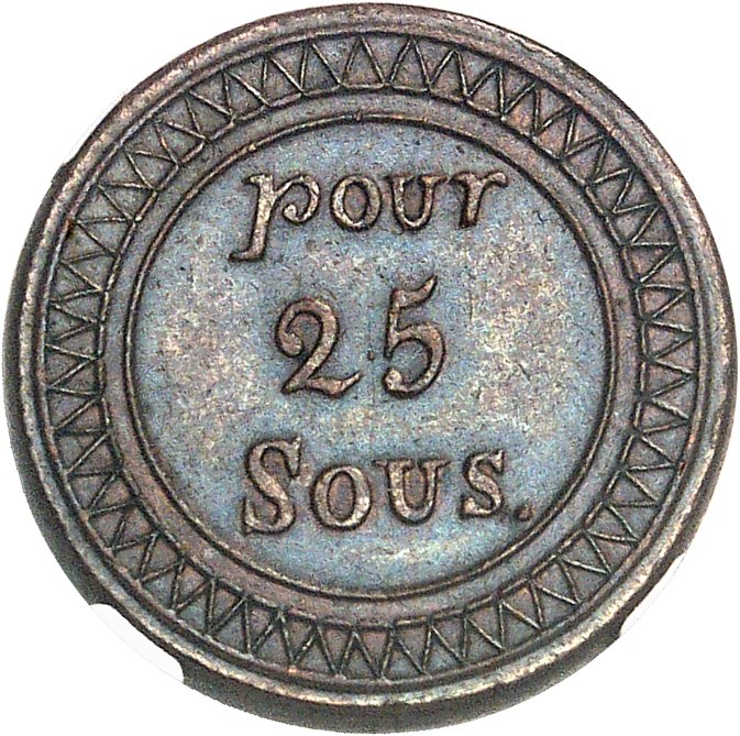 Rv. Dans un grènetis hachuré, en trois lignes : POUR 25 SOUS.