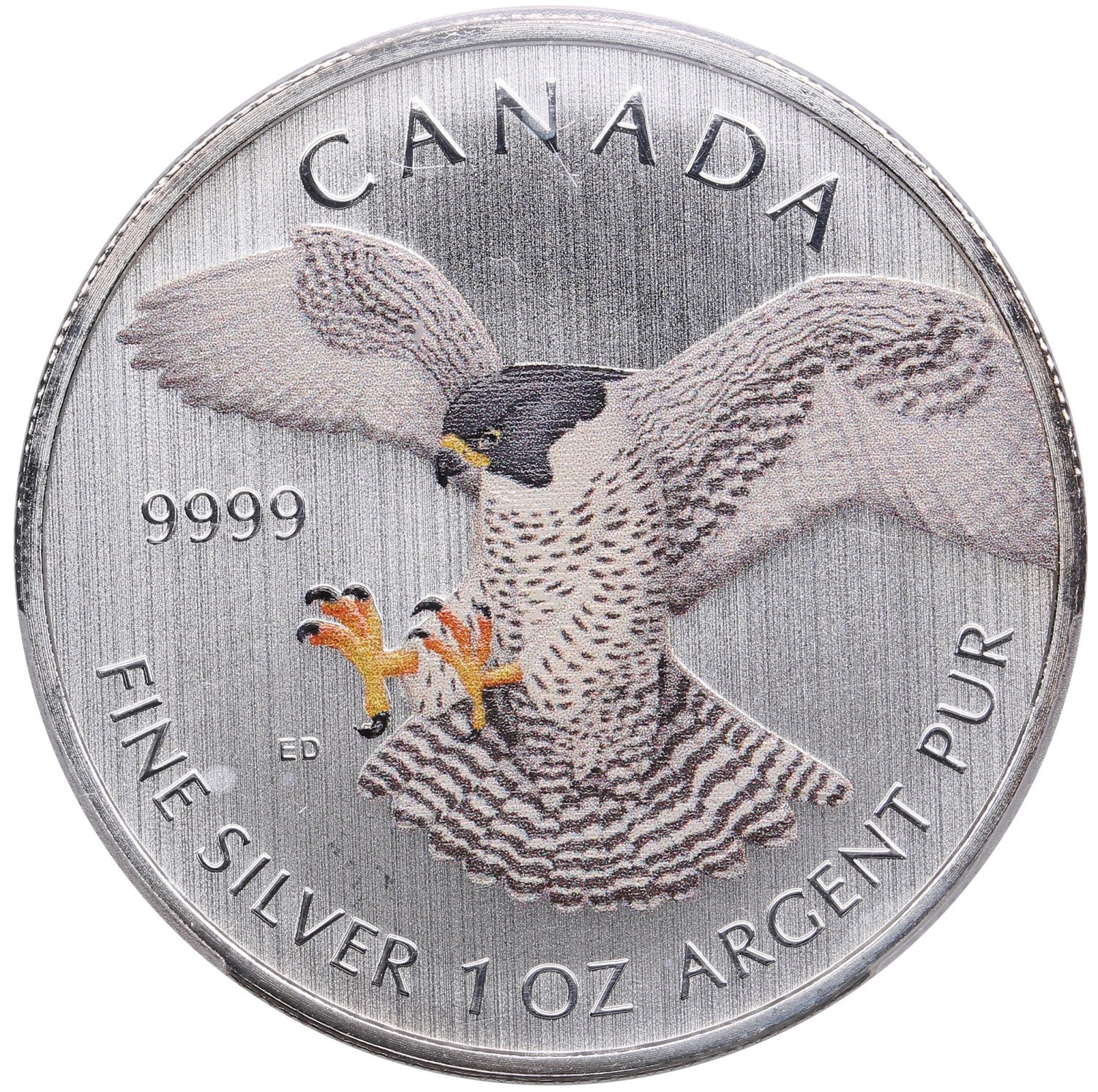 1 oz. silver bullion coinage. Peregrine Falcon. Coloured. Designer’s Initials ED – Emily S. Damstra. N 320177. Highest grade recorded in the PCGS population report.