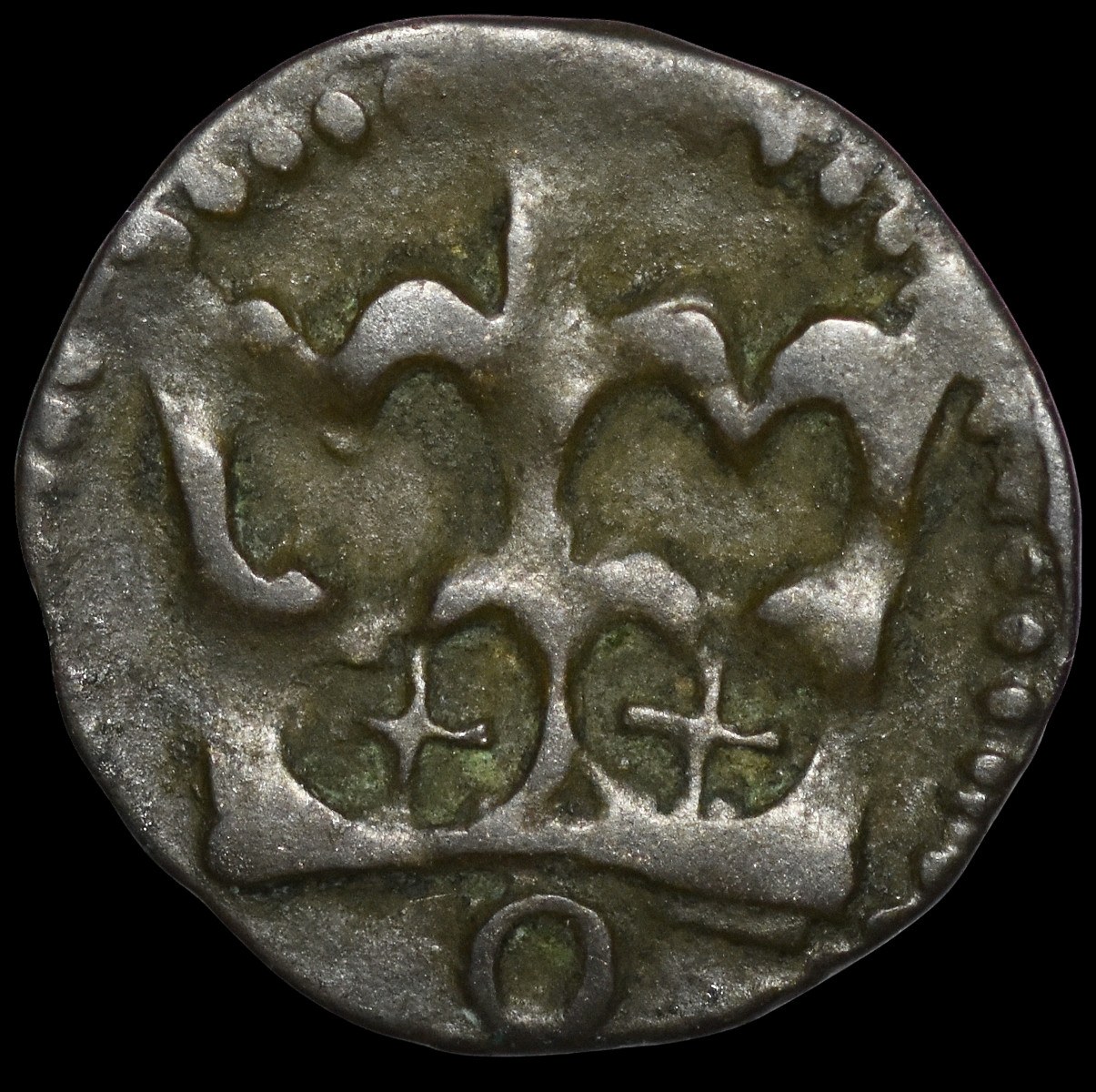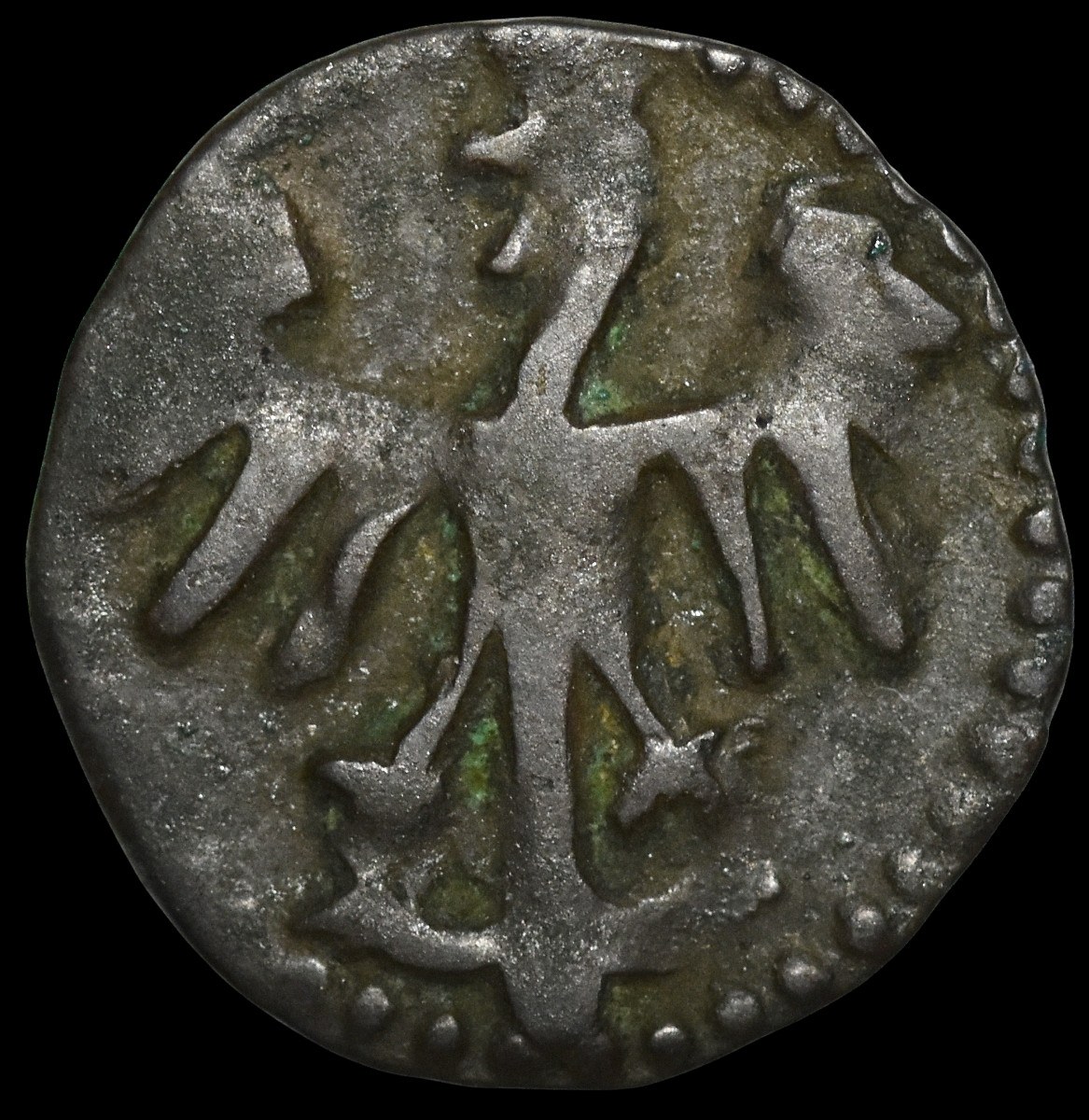 Charakterystyczny denar Kazimierza IV Jagiellończyka z pierścieniem pod koroną.