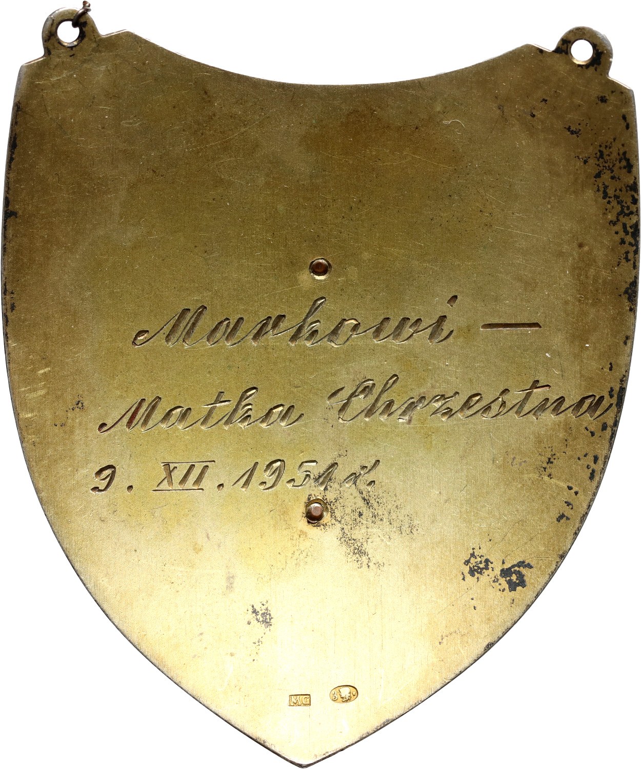 Srebro, waga 13,11 g. Wymiary: 48,30 x 57,30. Na odwrocie punca srebra próby 3 oraz dedykacja.