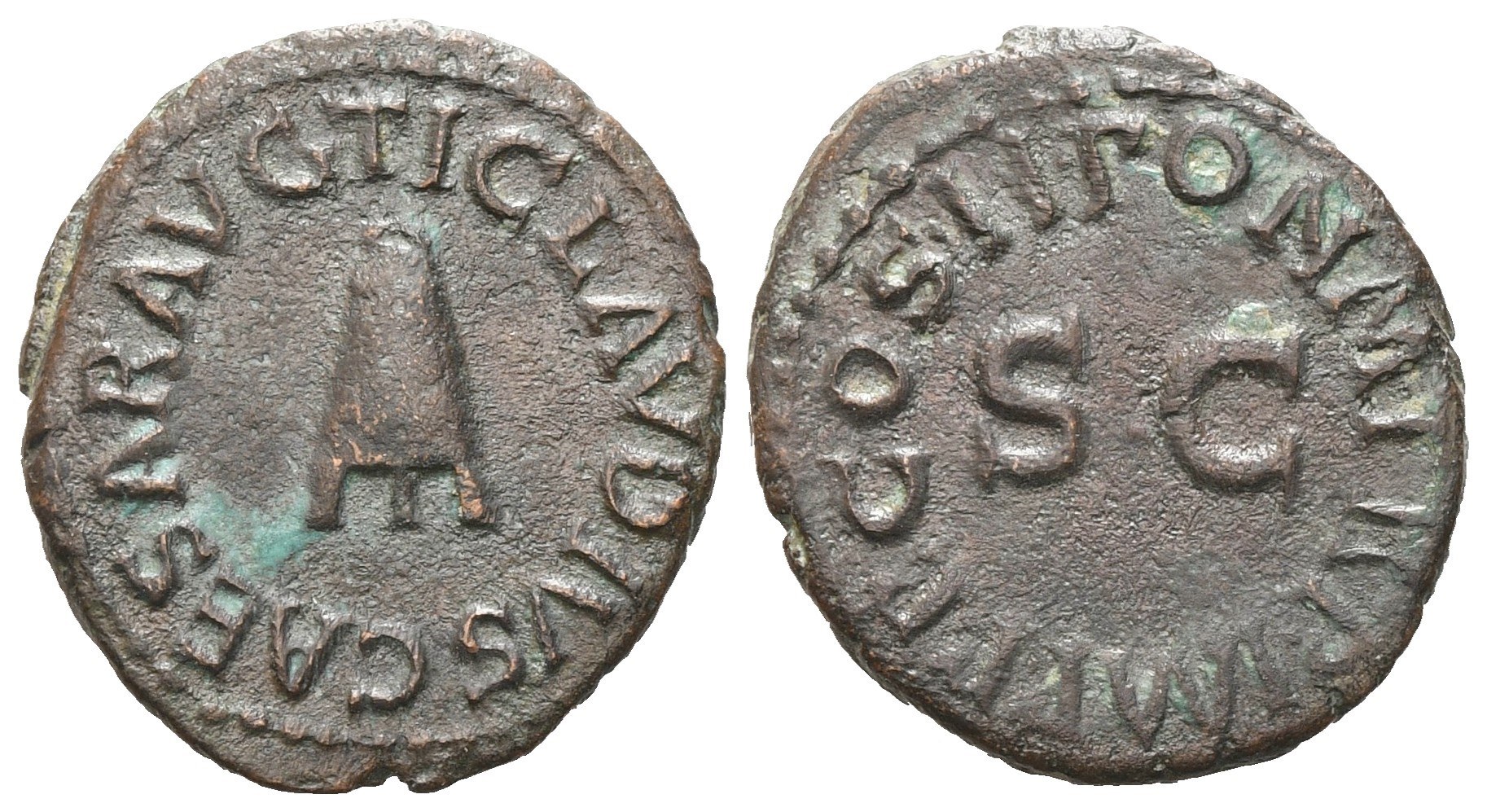 TI CLAVDIVS CAESAR AVG Three-legged modius; Rv. PON M TR P IMP P P COS II around large S • C. RIC I 90; von Kaenel Type 67. Dark brown patina with some green deposits. Extremely fine.