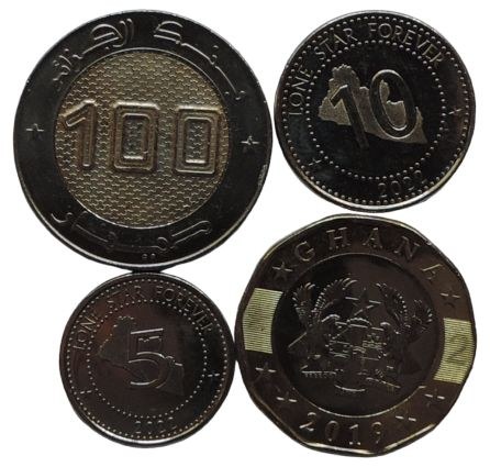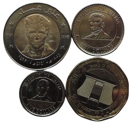 Alžír 100 dinár 2021 příležitostný, Ghana 1 cedi 2019, Liberie 5 a 10 dollar 2022 4ks