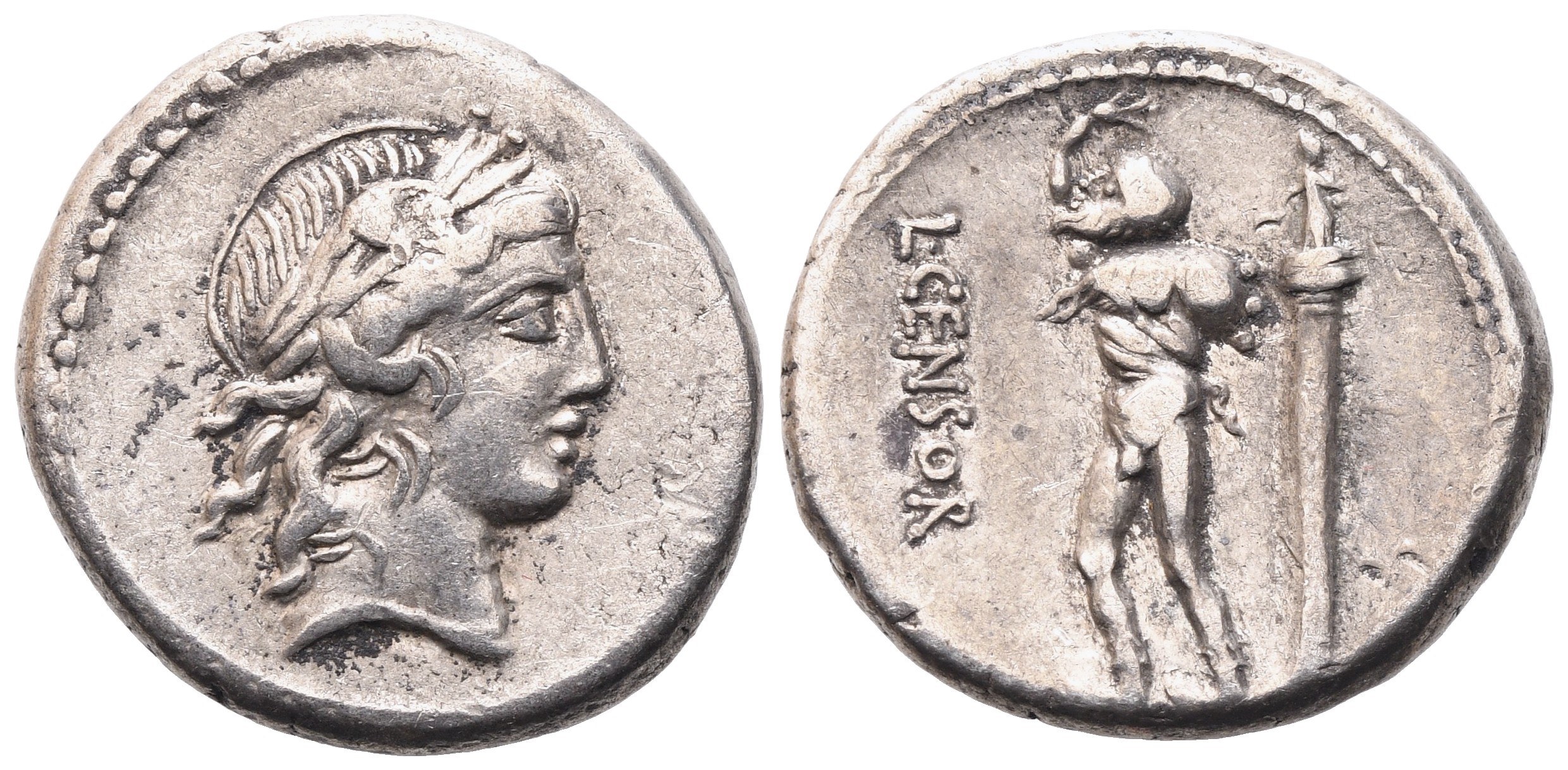 Laureate head of Apollo to r.; Rv. Marsyas advancing l., extending right arm and holding wineskin in his left hand over his left shoulder; before, L·CENSOR downwards; behind, column bearing statue on top. Crawford 363/1d; Babelon, (Marcia) 24; Sydenham 737. About extremely fine.