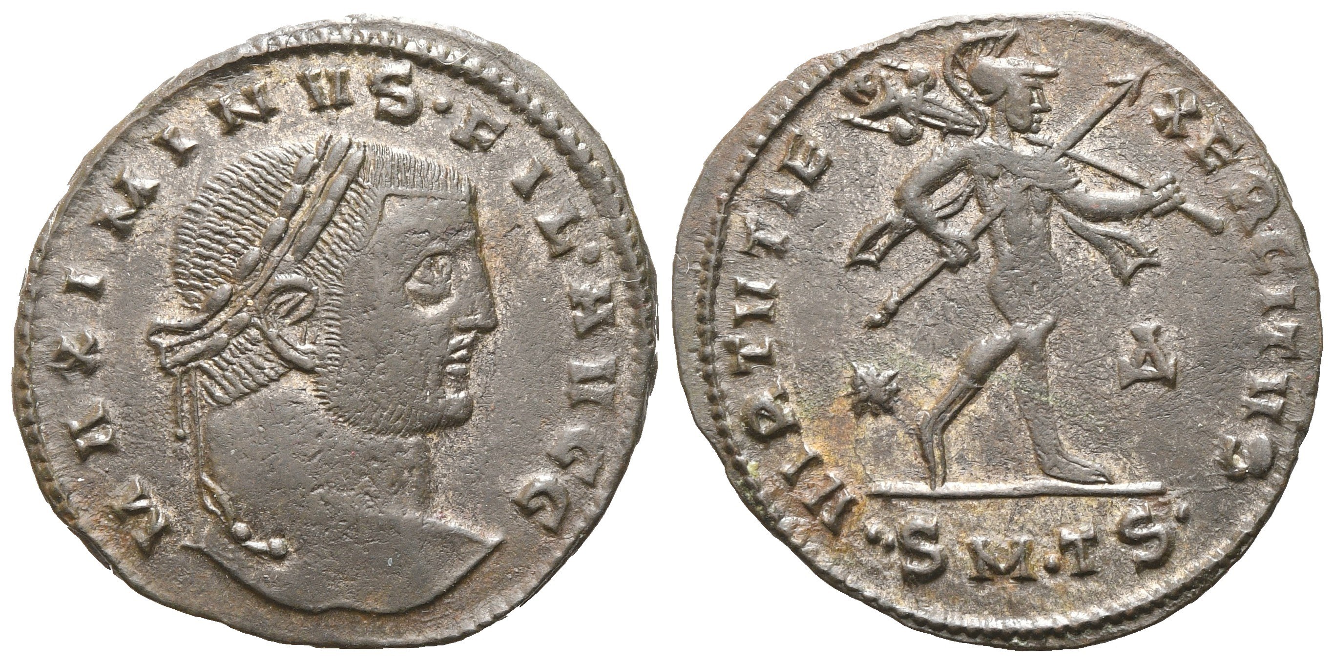 MAXIMINVS FIL AVGG Laureate head r.; Rv. VIRTVTI EXERCITVS  Virtus advancing r., holding traverse spear , trophy over l. shoulder; in field, */Δ; in ex., SMTS. RIC VI, 39A. About extremely fine.