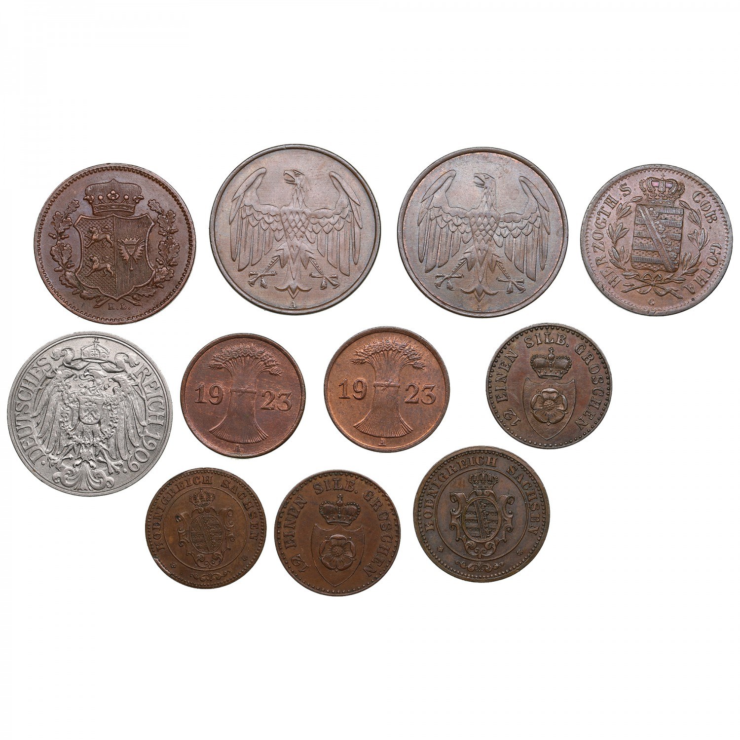 XF-UNC. Empire 25 Pfennig 1909 D. KM 18. Weimar Republic 1 Rentenpfennig 1923 A (2), KM 30; 4 Reichspfennig 1932 A (2), KM 75. Saxe-Coburg-Gotha 2 Pfennige 1841 G. KM 84. Schleswig-Holstein 1 Dreiling 1850. KM 160. Lippe 1 Pfennig 1851 A, 1858 A. KM 260. Saxony (Albertine line) 1 Pfennig & 2 Pfennige 1873 B. KM 1216; 1217.
