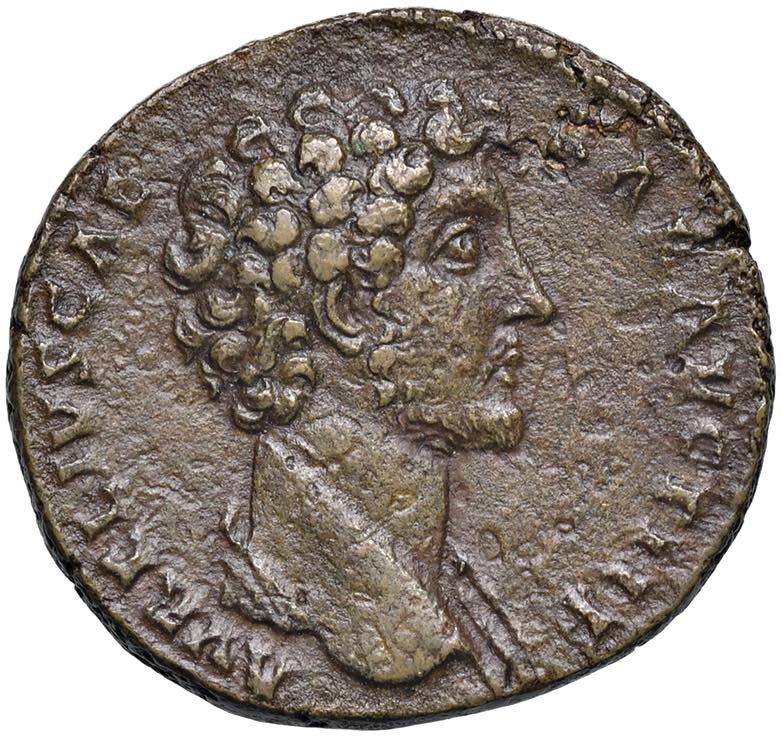 Marco Aurelio (161-180) Sesterzio - Busto drappeggiato a d. - R/ TR POT III COS II, la Pietà stante a sinistra con un fanciullo in braccio e un altro accanto a lei - RIC 1274 AE (g 22,48) Una modesta porosità al D/, splendido R/ con rilievi intatti. Dalla nostra asta 55, lotto 91