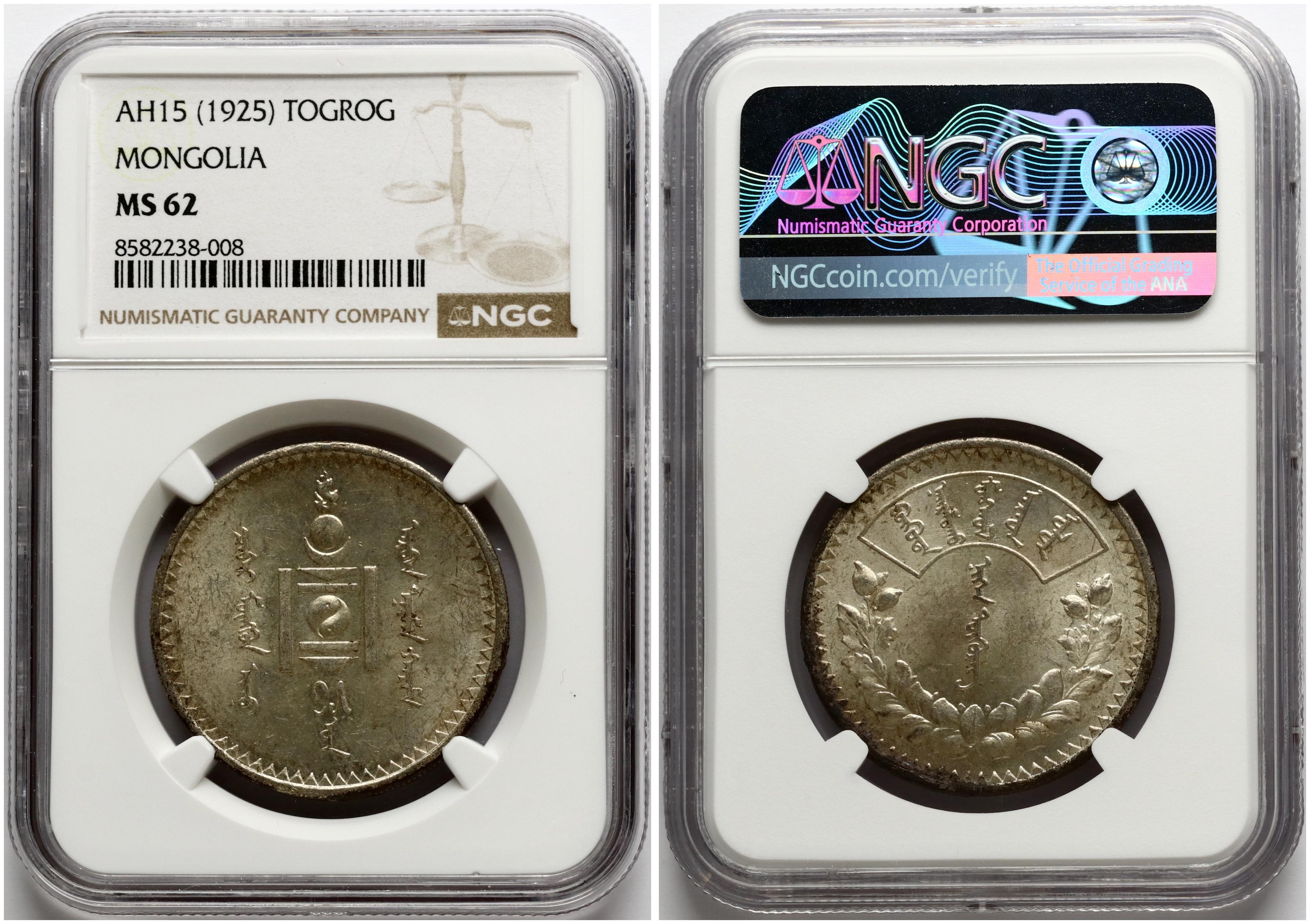 Mongolia. Togrog 15 (1925). Silver. KM 8. NGC MS 62.