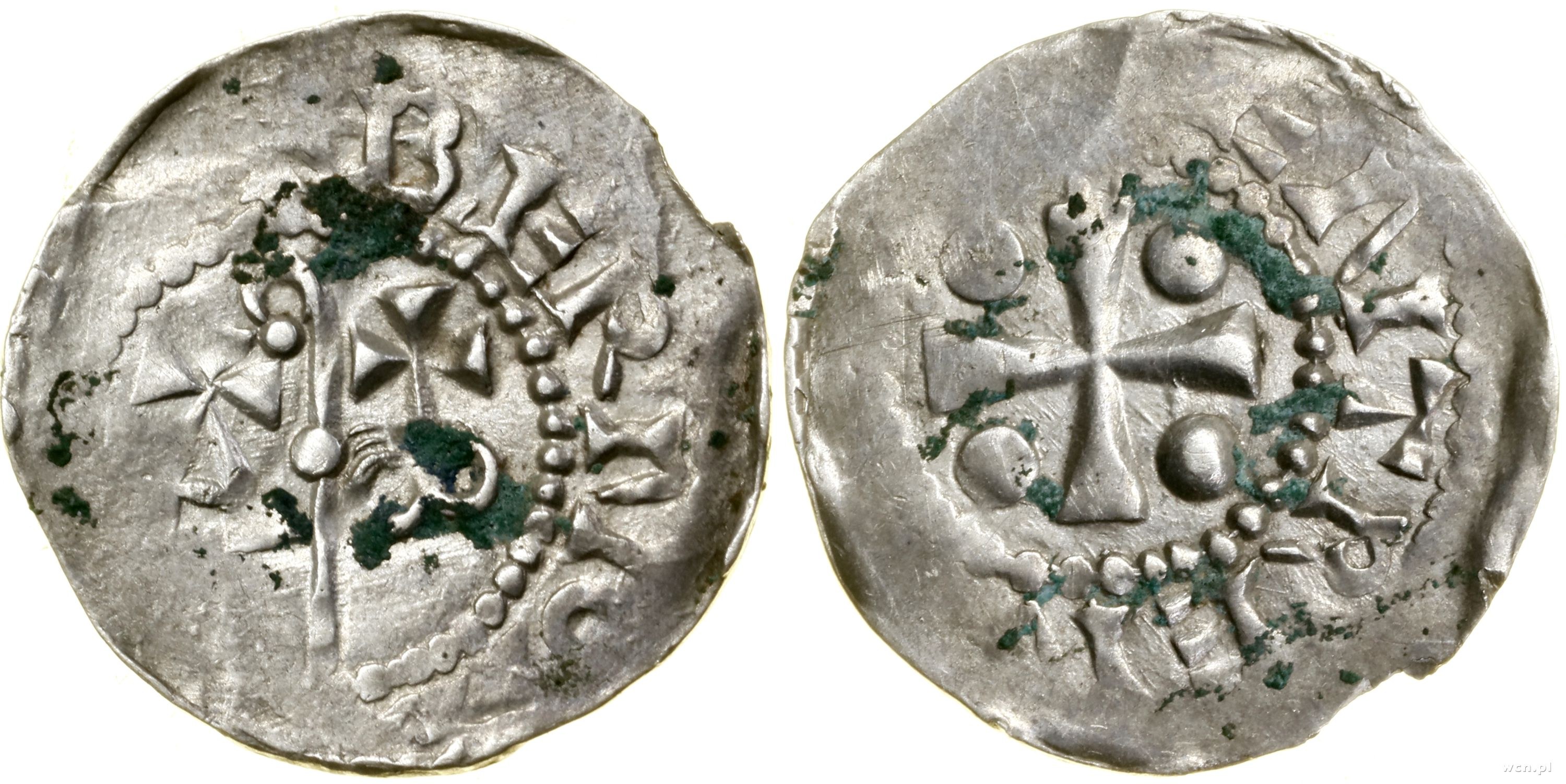 Aw: Pastorał, po bokach Alfa i Omega zwieńczone krzyżami, + BERNO…, Rw: Krzyż, w każdym kącie kulka, …ENTREN…