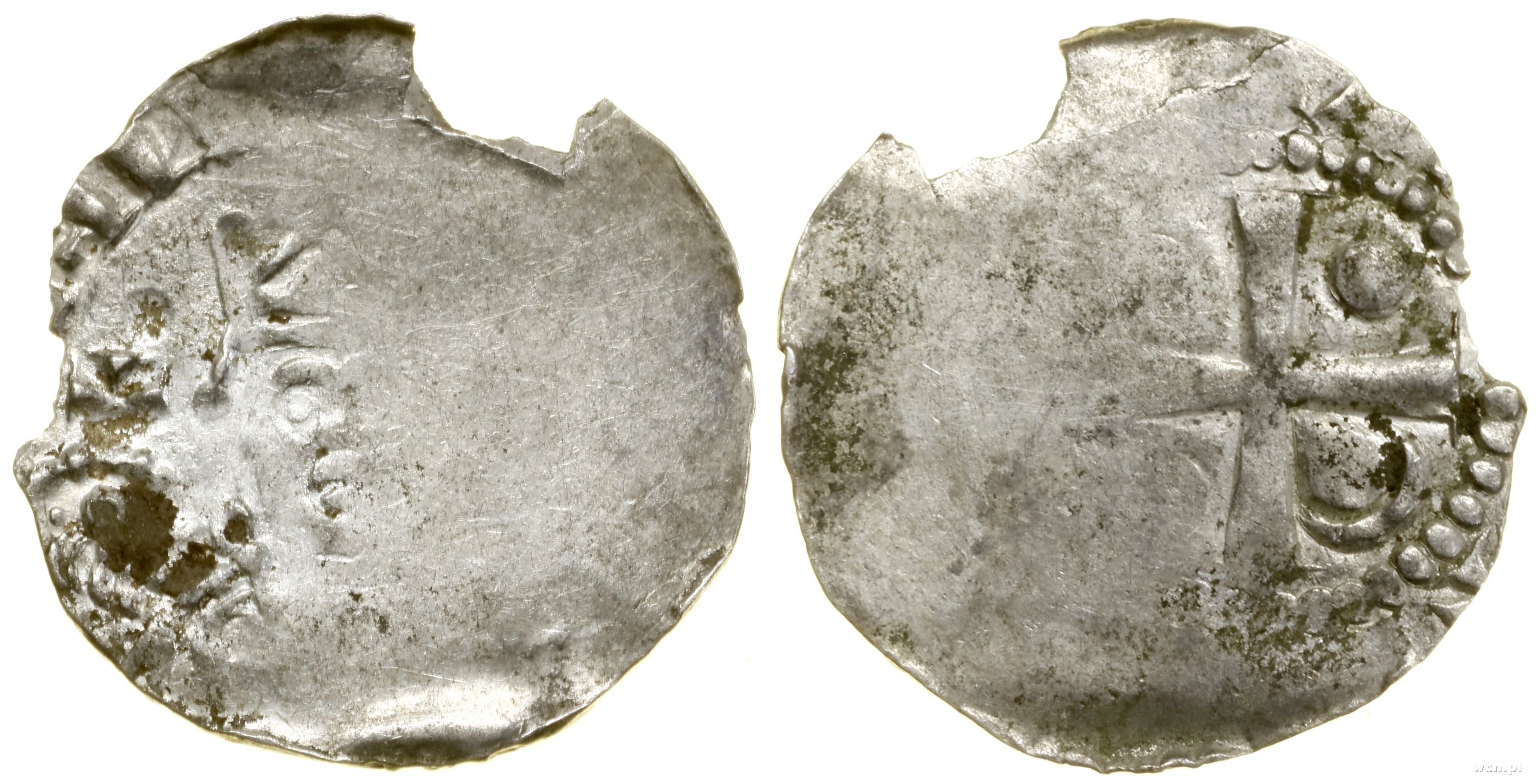 Aw: Głowa na wprost, w czapce, legenda, Rw: Krzyż, w trzech kątach po kulce, w czwartym klin i łuk, legenda