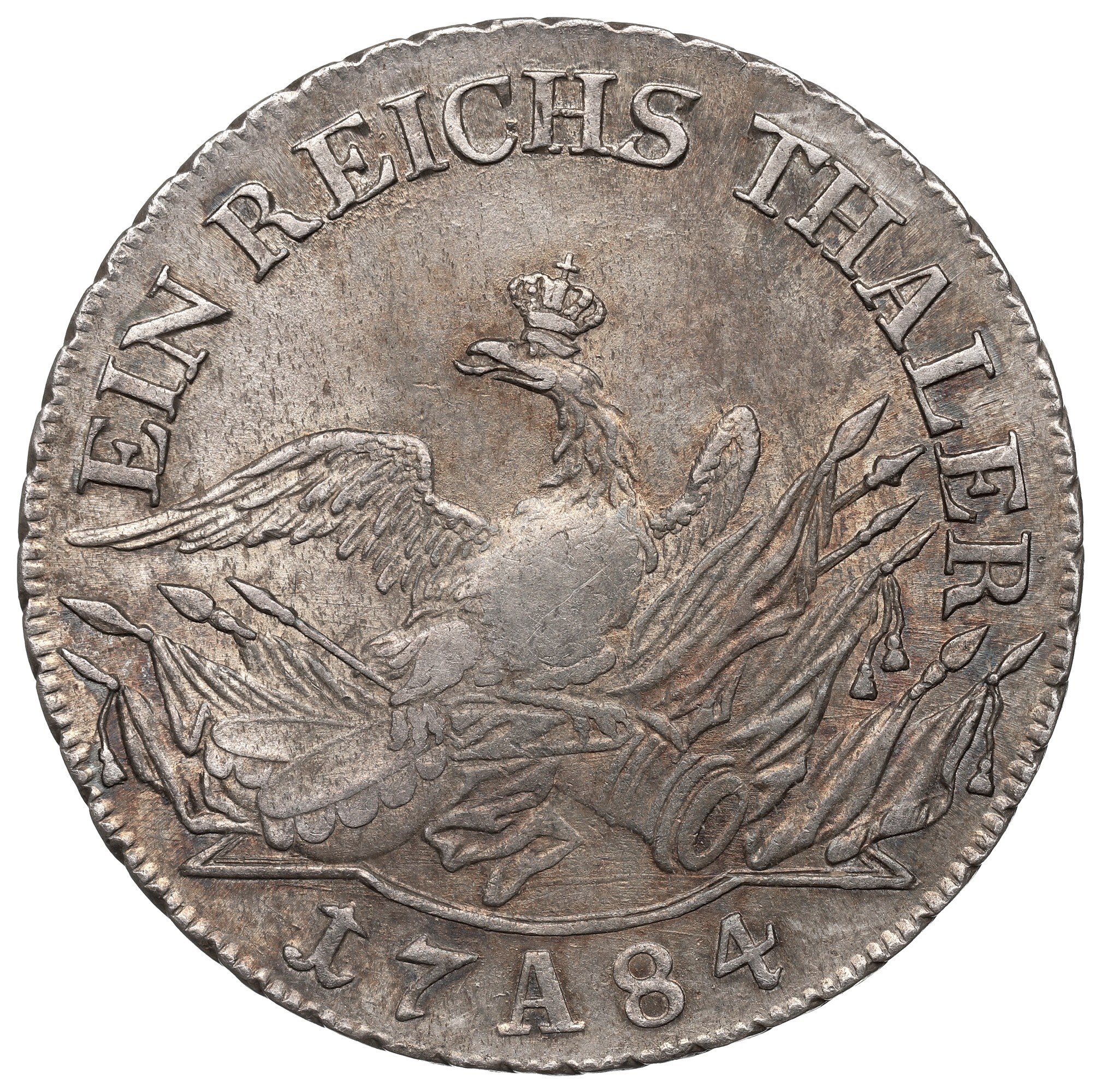 Rewers: orzeł siedzący na zdobyczach wojennych, w otoku EIN REICHS THALER, w odcinku na konsoli data 1784 przedzielona oznaczeniem mennicy A;
