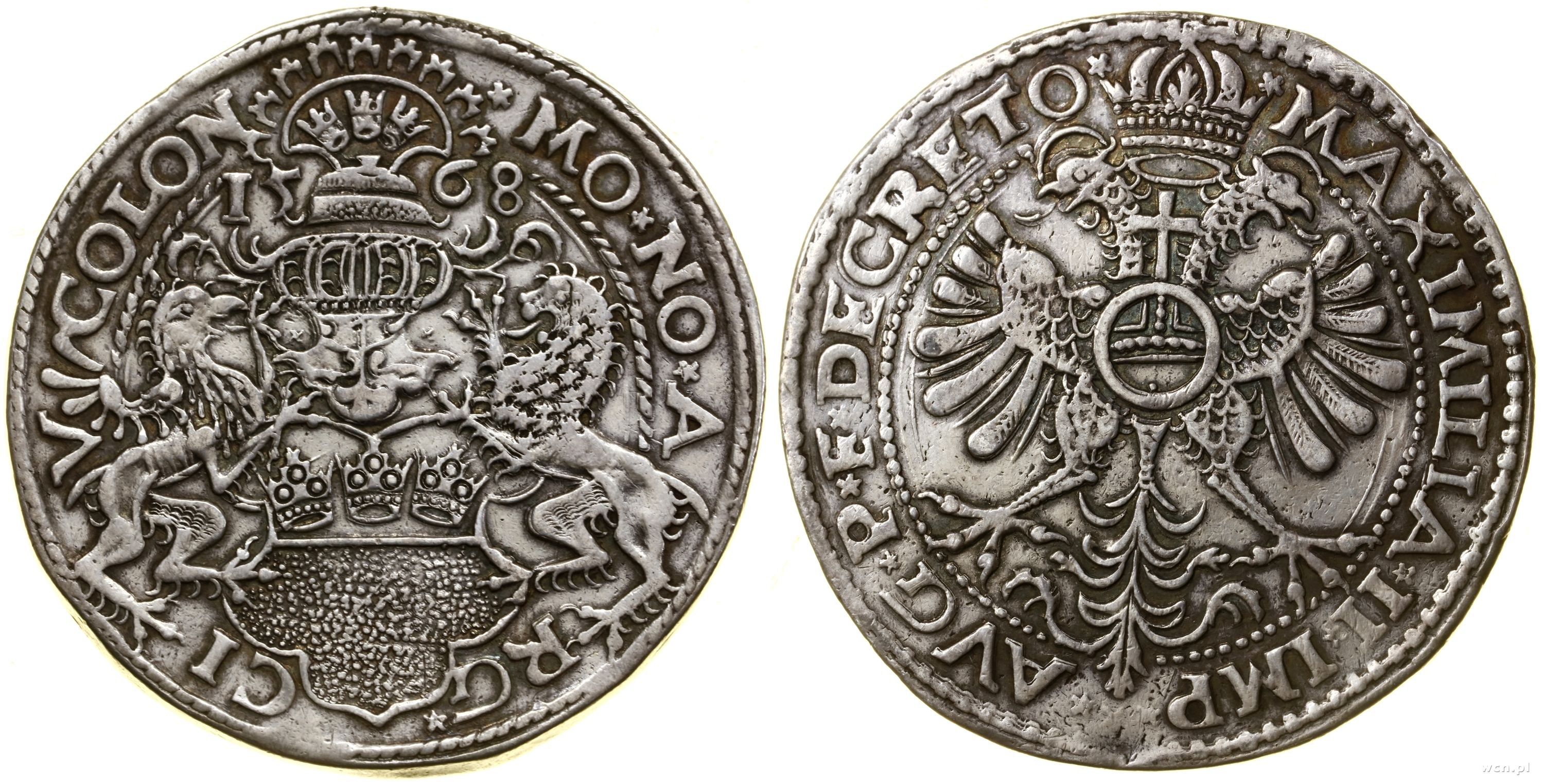 Aw: Tarcza herbowa, powyżej hełm z klejnotem przedziela datę, MO NO A CIV COLON, Rw: Ukoronowany dwugłowy orzeł z jabłkiem panowania na piersi, MAXIMILIA II IMP AVG P F DECRETO