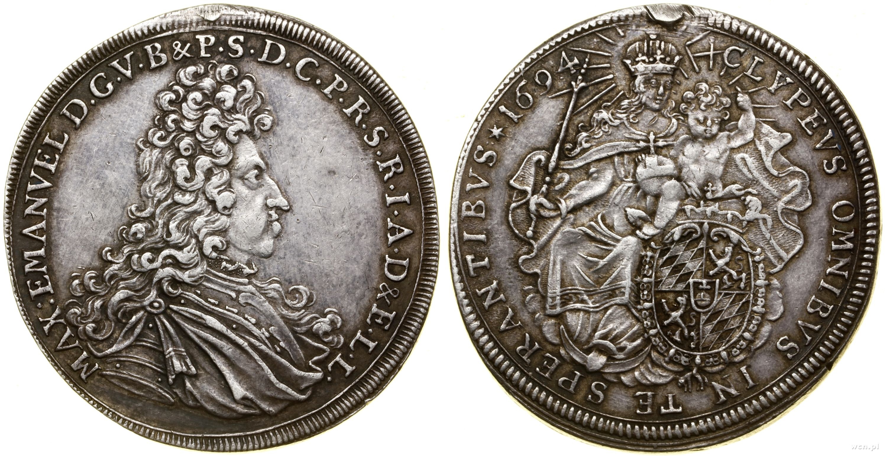 Aw: Popiersie księcia w prawo, MAX EMANVEL D G V B & P S D C P R S R I A D & E L L; Rw: Madonna z Dzieciątkiem, poniżej tarcza herbowa, CLYPEVS OMNIBVS IN TE SPERANTIBVS 1694