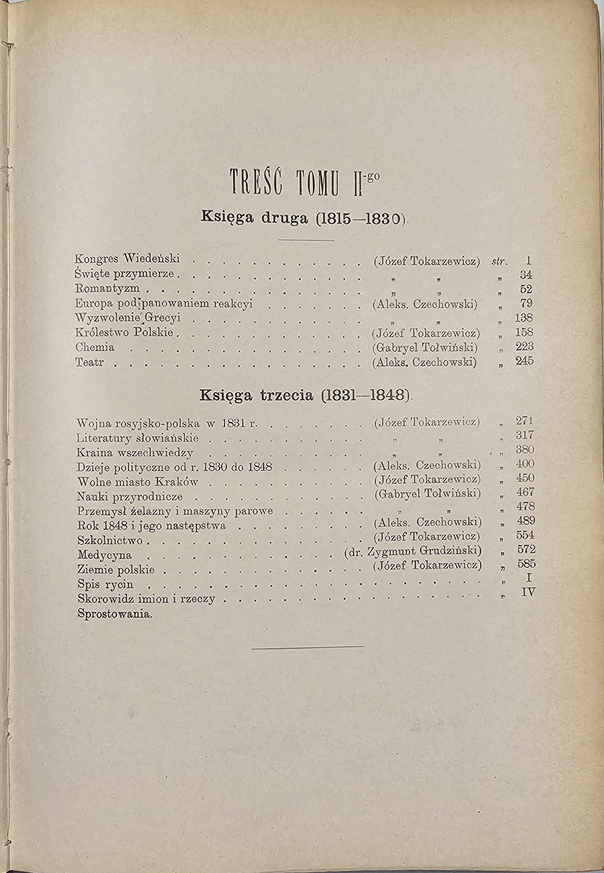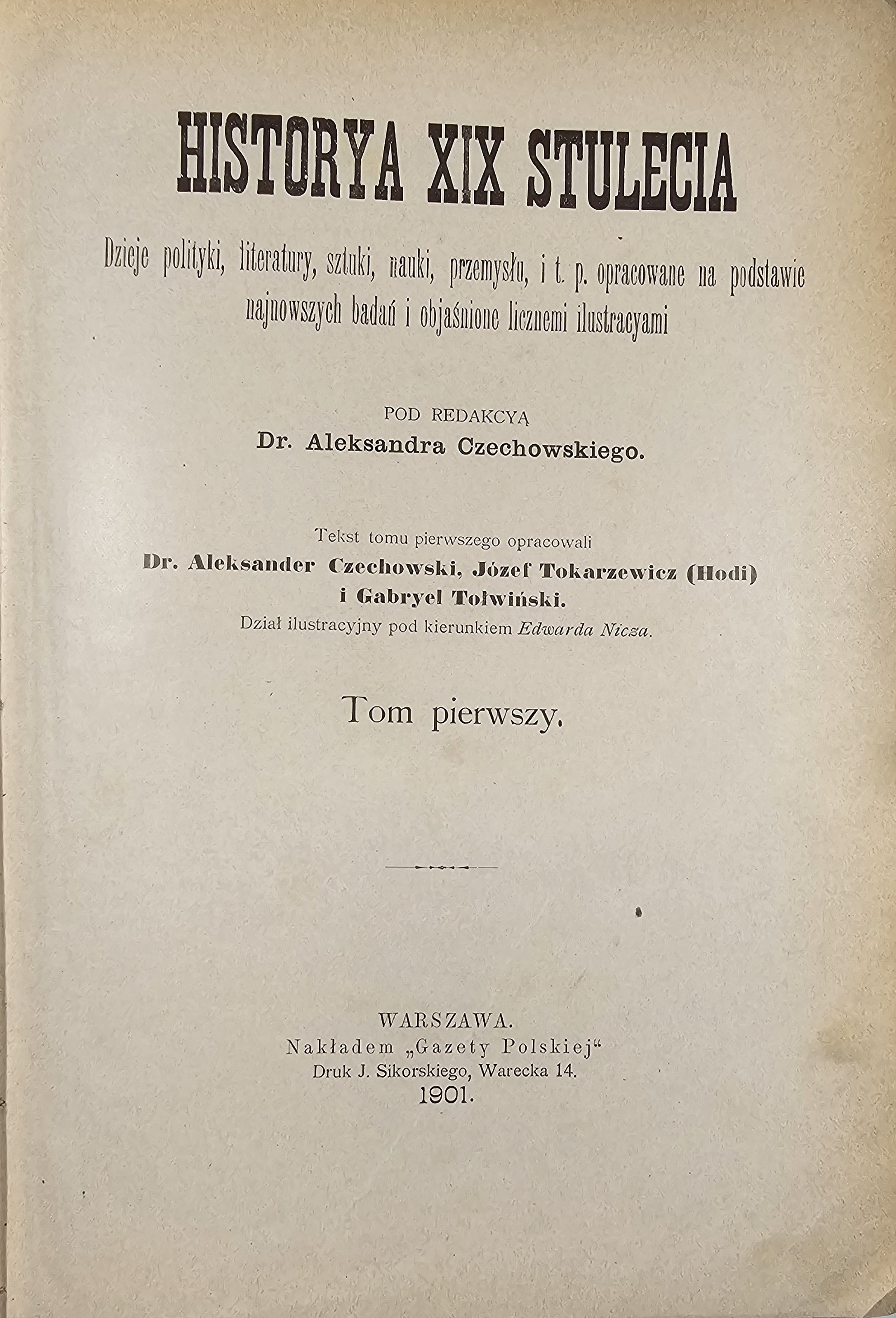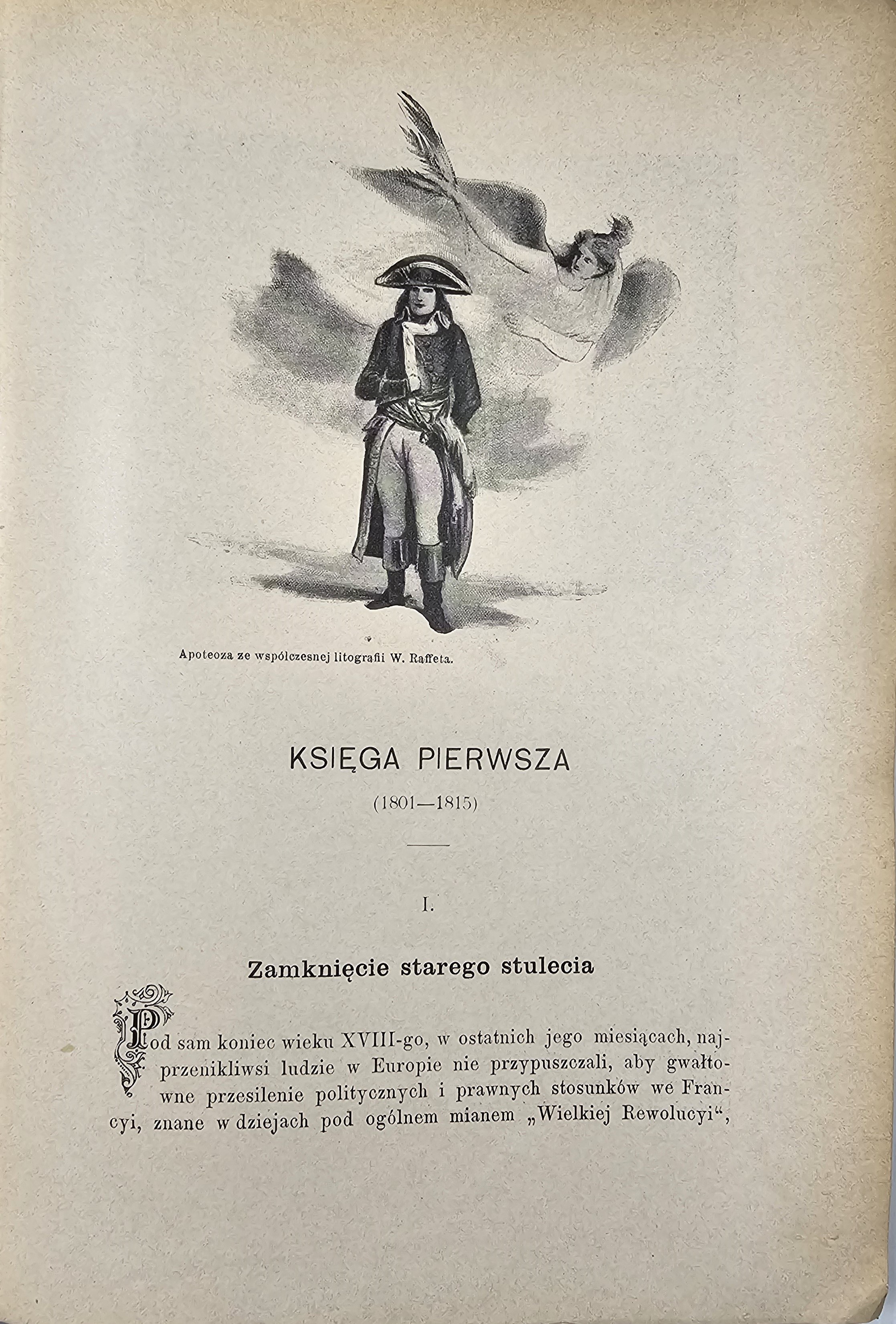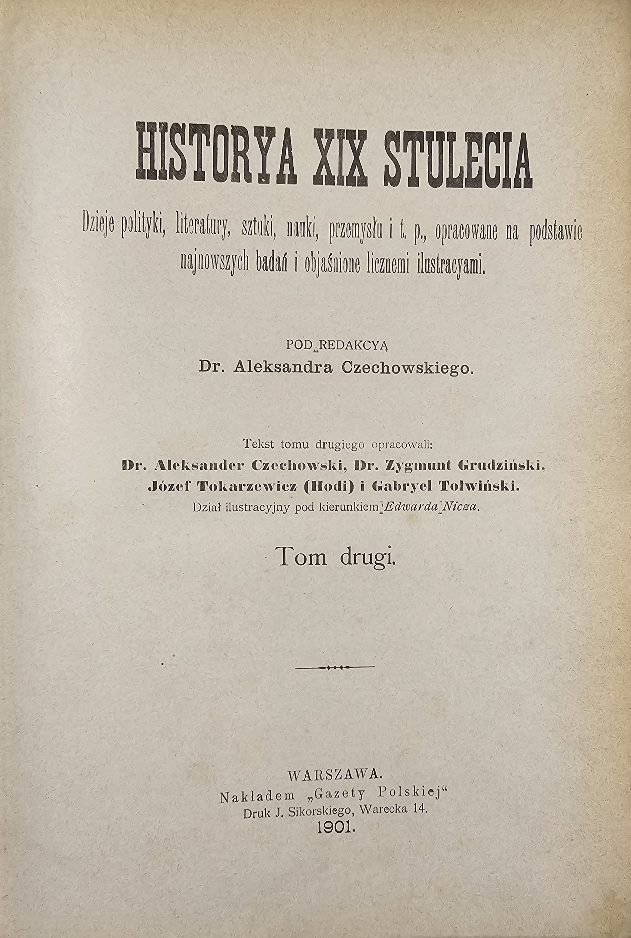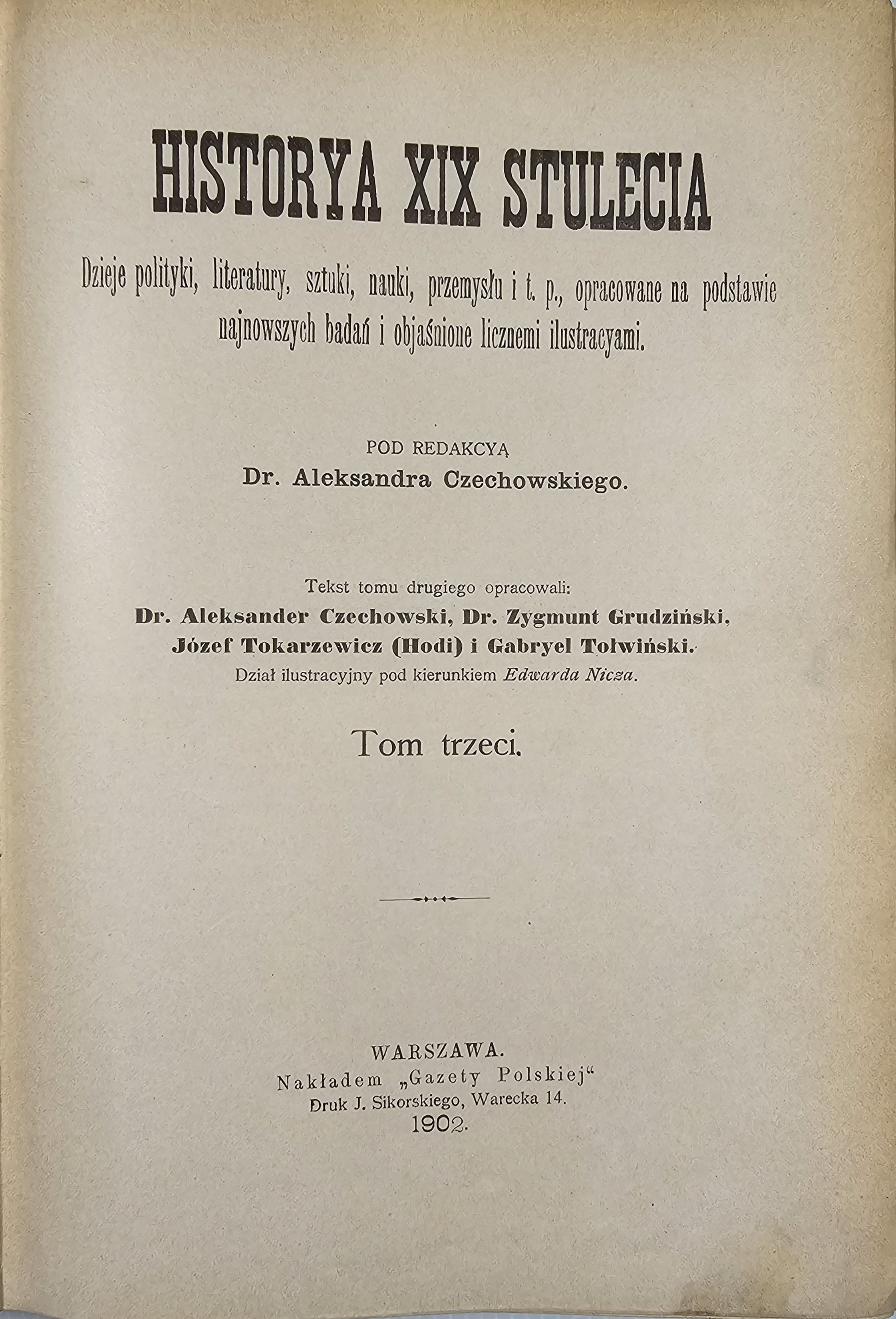 Druk. J. Sikorskiego. 4, s. 599, [1], XVIII, [2]; [8], 599, [1], XVI; [8], 691, [1], XX.; bogato ilustr., opr. psk. sygn. pieczęciami na wyklejkach: M. Krzemiński Introligator w Warszawie: skóra i płótno brązowe, grzbiety pięciopolowe, ze złoconą tytulaturą, sygnowane na dole F.J. Na przednich wyklejkach każdego tomu exlibris. Grzbiety i rogi opraw przetarte, poza tym stan dobry. Zawiera min.: Zamknięcie starego stulecia. Ruch umysłowy na przełomie wieków. Podróże i badania geograficzne. Księstwo Warszawskie. Zatargi z Papieżem. Architektura i sztuka