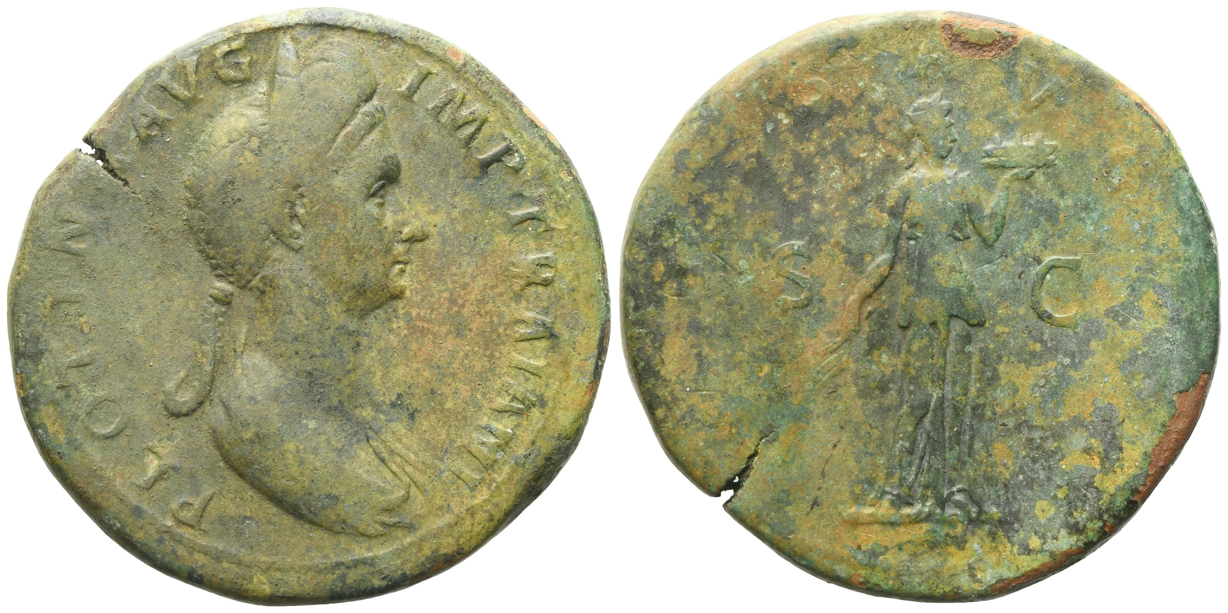 PLOTINA AVG IMP TRAIANI Draped bust of Plotina to r., wearing stephane; Rv. [FIDE]S AVG[VST] / S - C Fides standing facing, head to r., holding basket of fruits with her l. hand and grain-ears in her r. BMC 1080. Cohen 12. RIC 740. Woytek 711. Rare. Attractive green patina with brassy shades. Very fine.