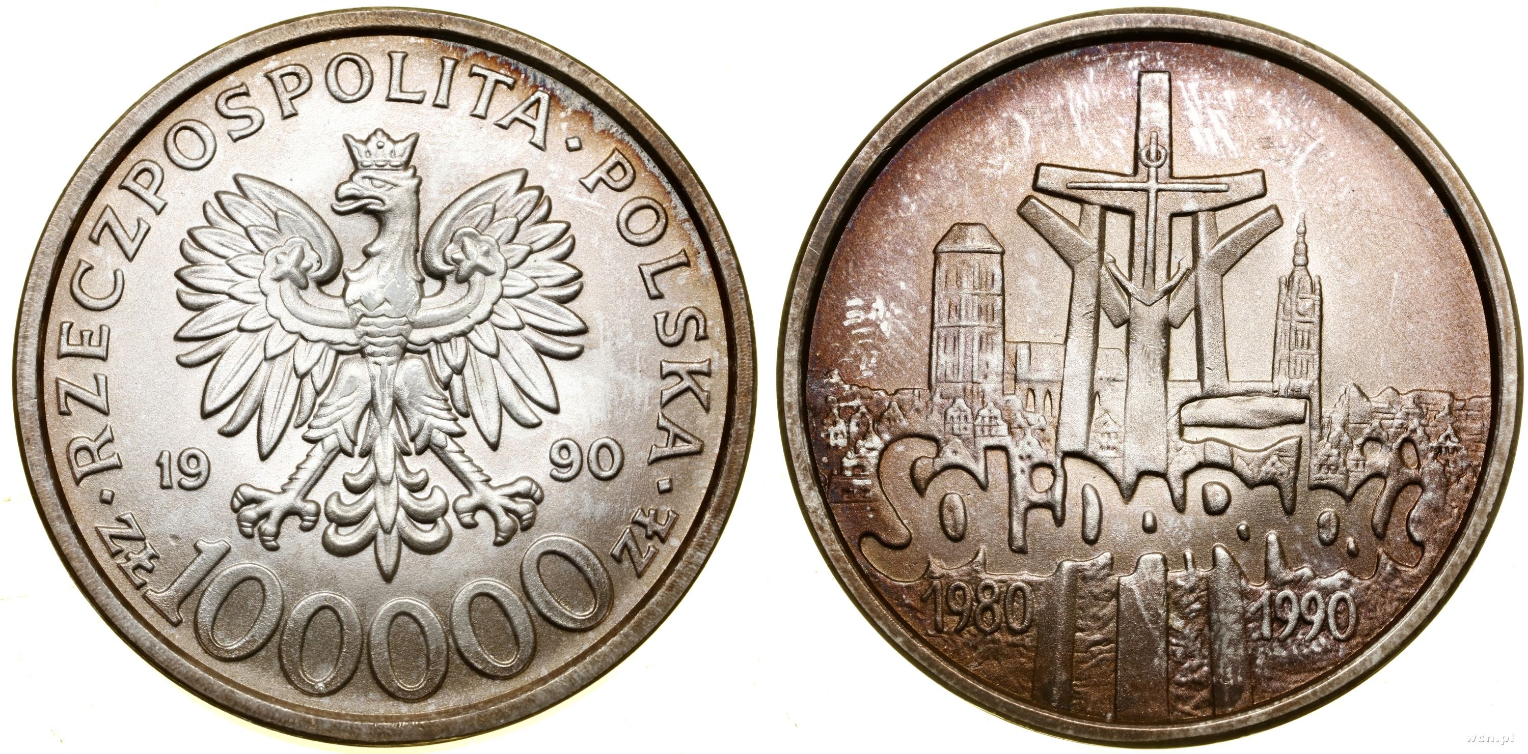 Solidarność 1980–1990, /typ B/, na awersie ZŁ blisko nominału, bez litery L na rewersie