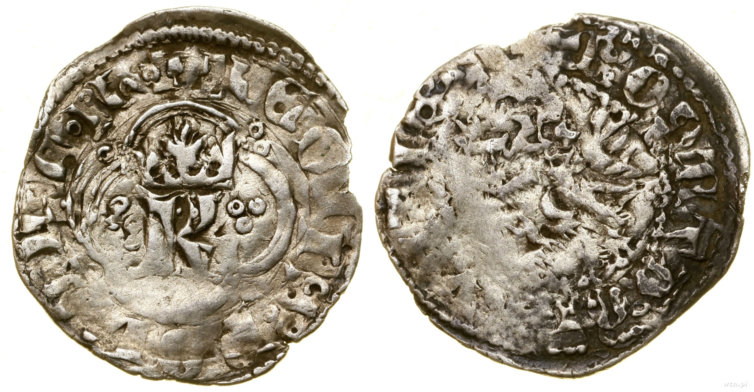 Aw: Ukoronowana litera K wpisana w rozetę, z boków pierścienie, REGIS POLONIE K, Rw: Lew w lewo, + MONETA...