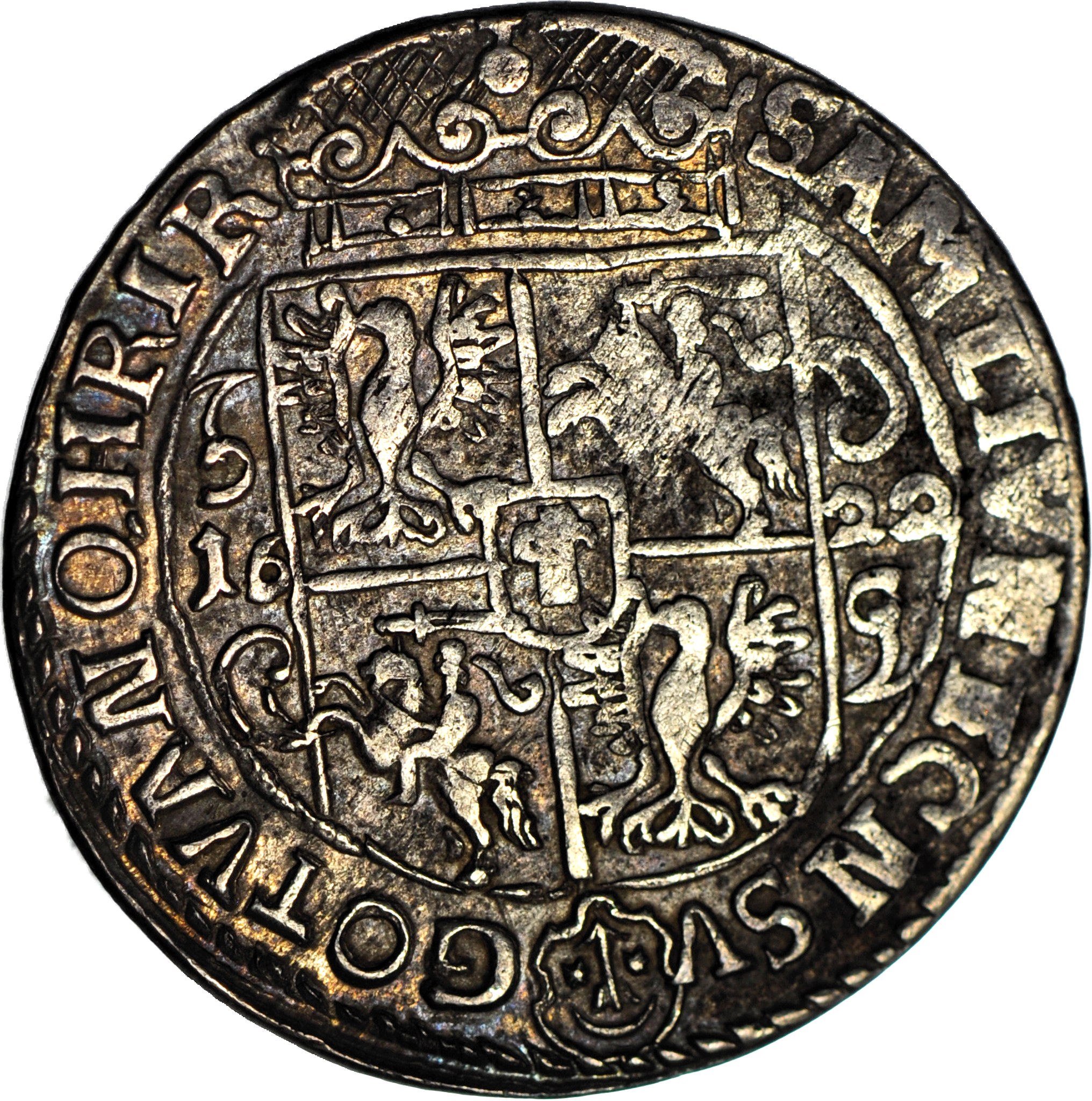 Ogromna ciekawostka, ciekawy błąd bicia, w wyniku którego król wygląda jakby wrócił z długich wczasów odchudzających, a cała reszta szczegółów to jeden wielki miszmasz, podwójny miecz, berło. Moneta wyjątkowo może urozmaicić kolekcję ortów bydgoskich.