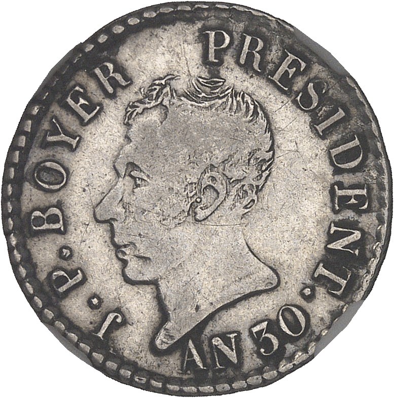 Av. J. P. BOYER PRESIDENT. Tête à gauche ; au-dessous AN (date).