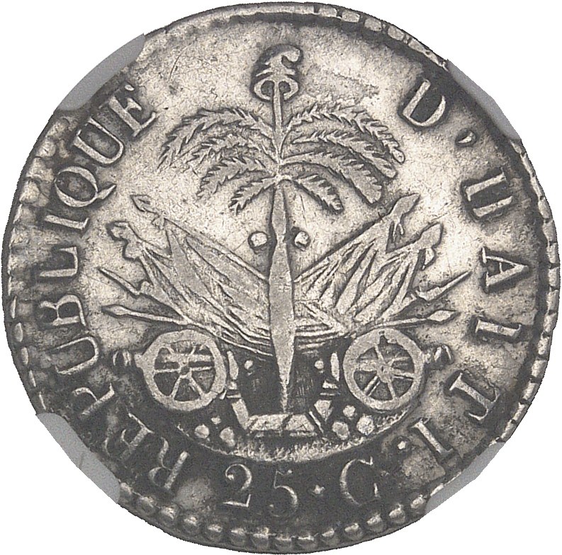Rv. REPUBLIQUE D’HAITI. Armes de la République d’Haïti ; au-dessous, 25. C.