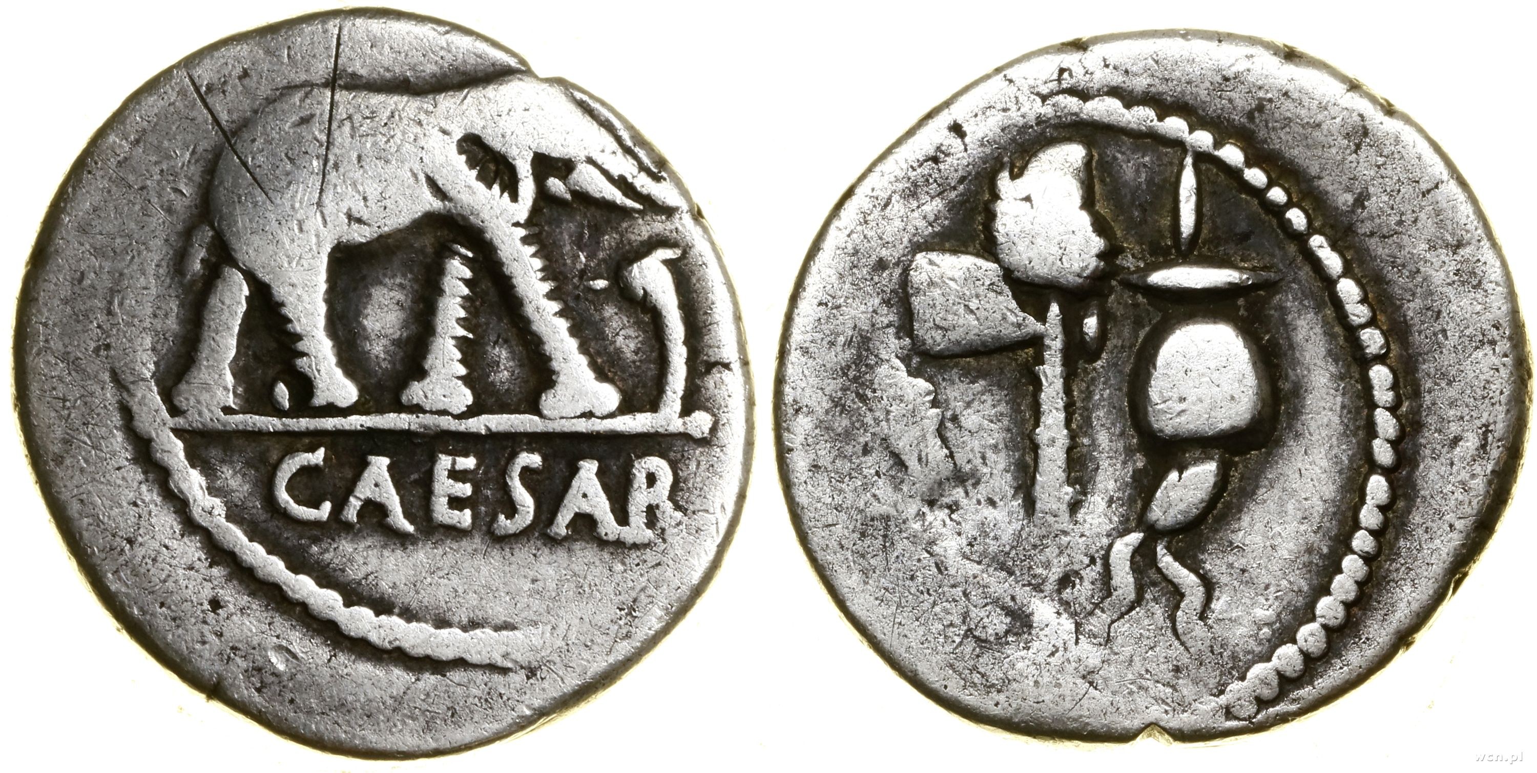 Aw: Słoń kroczący w prawo, depczący węża, w odcinku CAESAR; Rw: Utensylia kapłańskie: czerpak (simpulum), kropidło (aspergillum), topór (securis) i szpiczasta czapka kapłańska (apex)